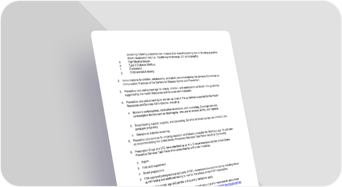 54 screening following a positive non-invasive stool-based screening test or following a positive direct visualization test (i.e., flexible sigmoidoscopy, CT colonography), d. High blood pressure, e. Type 2 Diabetes Mellitus, f. Cholesterol, g. Child and adult obesity. 2. Immunizations for children, adolescents, and adults recommended by the Advisory Committee on Immunization Practices of the Centers for Disease Control and Prevention; 3. Preventive care and screenings for infants, children, and adolescents as listed in the guidelines supported by the Health Resources and Services Administration; 4. Preventive care and screening for women as listed in the guidelines supported by the Health Resources and Services Administration, including: a. Women’s contraceptives, sterilization treatments, and counseling. Coverage includes contraceptive devices such as diaphragms, intra uterine devices (IUDs), and implants b. Breastfeeding support, supplies, and counseling. Benefits for breast pumps are limited to one pump per pregnancy. c. Gestational diabetes screening. 5. Preventive care services for smoking cessation and tobacco cessation for Members age 18 and older as recommended by the United States Preventive Services Task Force including Counseling. 6. Prescription Drugs and OTC items identified as an A or B recommendation by the United States Preventive Services Task Force when prescribed by a Provider including: a. Aspirin b. Folic acid supplement c. Bowel preparations d. FDA-approved preexposure prophylaxis (PrEP), related services and monitoring including follow- up HIV testing and additional testing to monitor the effects of the PrEP medications. Please note that certain age and gender and quantity limitations apply. You may call Member Services at the number on your Identification Card for more details about these services or view the federal government’s websites, http://www.healthcare.gov/what-are-my-preventive- care-benefits, http://www.ahrq.gov, and http://www.cdc.gov/vaccines/recs/acip/. In addition to the Federal requirements above, preventive coverage also includes the following Covered Services: • Routine screening mammograms. • Routine prostate specific antigen testing. • Routine colorectal cancer examination and related laboratory tests. • Follow-up colonoscopy to a colorectal cancer screening test assigned either an "A" or "B" grade by the United States Preventive Services Task Force that was positive.