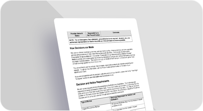 34 Provider Network Status Responsibility to Get Precertification Comments NOTE: For an Emergency Care admission, precertification is not required. However, you, your authorized representative or Doctor must tell us of the admission as soon as possible. How Decisions are Made We use our clinical coverage guidelines, such as medical policy, clinical guidelines, and other applicable policies and procedures to help make Medical Necessity decisions. This includes decisions about Prescription Drugs as detailed in the section “Prescription Drugs Administered by a Medical Provider”. Medical policies and clinical guidelines reflect the standards of practice and medical interventions identified as proper medical practice. We reserve the right, on behalf of the Employer, to review and update these clinical coverage guidelines from time to time. You are entitled to ask for and get, free of charge, reasonable access to any records concerning your request. To ask for this information, call the Precertification phone number on the back of your Identification Card. If you are not satisfied with the decision under this section of your benefits, please refer to the “Your Right To Appeal” section to see what rights may be available to you. Decision and Notice Requirements We will review requests for benefits according to the timeframes listed below. The timeframes and requirements listed are based on federal laws. If you live in and/or get services in a state other than the state where your Plan was issued other state-specific requirements may apply. You may call the phone number on the back of your Identification Card for more details. We will accept a request for Pre-service Reviews sent to us by your provider through secure electronic submission. Type of Review Timeframe Requirement for Decision and Notification Urgent Pre-service Review 72 hours or 2 business days from the receipt of request whichever is less Non-Urgent Pre-service Review 2 business days from the receipt of request Urgent Continued/Concurrent Stay Review when request is received more than 24 hours before the end of the previous authorization 24 hours from the receipt of the request Urgent Continued/Concurrent Stay Review when request is received less than 24 hours before the end of the previous authorization or no previous authorization exists 72 hours from the receipt of the request or 2 business days from the receipt of request whichever is less Non-urgent Continued/Concurrent Stay Review for ongoing outpatient treatment 2 business days from the receipt of request Post-Service Review 2 business days from the receipt of request