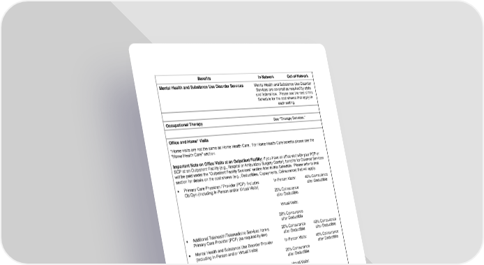 19 Benefits In-Network Out-of-Network Mental Health and Substance Use Disorder Services Mental Health and Substance Use Disorder Services are covered as required by state and federal law. Please see the rest of this Schedule for the cost shares that apply in each setting. Occupational Therapy See “Therapy Services.” Office and Home* Visits *Home visits are not the same as Home Health Care. For Home Health Care benefits please see the "Home Health Care" section. Important Note on Office Visits at an Outpatient Facility: If you have an office visit with your PCP or SCP at an Outpatient Facility (e.g., Hospital or Ambulatory Surgery Center), benefits for Covered Services will be paid under the “Outpatient Facility Services” section later in this Schedule. Please refer to that section for details on the cost shares (e.g., Deductibles, Copayments, Coinsurance) that will apply. • Primary Care Physician / Provider (PCP)- Includes Ob/Gyn (Including In-Person and/or Virtual Visits) In-Person Visits: 20% Coinsurance after Deductible Virtual Visits: 20% Coinsurance after Deductible 40% Coinsurance after Deductible • Additional Telehealth/Telemedicine Services from a Primary Care Provider (PCP) (as required by law) 20% Coinsurance after Deductible 40% Coinsurance after Deductible • Mental Health and Substance Use Disorder Provider (Including In-Person and/or Virtual Visits) In-Person Visits: 20% Coinsurance after Deductible Virtual Visits: 20% Coinsurance after Deductible 40% Coinsurance after Deductible • Specialty Care Physician / Provider (SCP) (including In- Person and/or Virtual Visits) In-Person Visits: 20% Coinsurance after Deductible Virtual Visits: 20% Coinsurance after Deductible 40% Coinsurance after Deductible • Additional Telehealth/Telemedicine Services from a Specialty Care Provider (SCP) (as required by law) 20% Coinsurance after Deductible 40% Coinsurance after Deductible