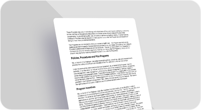 105 These Programs may vary in methodology and subject area of focus and may be modified by us from time to time, but they will be generally designed to tie a certain portion of an In-Network Provider’s total compensation to pre-defined quality, cost, efficiency or service standards or metrics. In some instances, In-Network Providers may be required to make payment to us under the Program as a consequence of failing to meet these pre-defined standards. The Programs are not intended to affect your access to health care. The Program payments are not made as payment for specific Covered Services provided to you, but instead, are based on the In-Network Provider’s achievement of these pre-defined standards. You are not responsible for any Copayment or Coinsurance amounts related to payments made by us or to us under the Program(s), and you do not share in any payments made by Network Providers to us under the Program(s). Policies, Procedures and Pilot Programs We, on behalf of the Employer, may adopt reasonable policies, procedures, rules and interpretations to promote the orderly and efficient administration of the Plan with which a Member shall comply. Under the terms of the Administrative Services Agreement, we, on behalf of the Employer, have the authority, in our discretion, to institute from time to time, pilot or test programs for utilization management, care management, case management, clinical quality, disease management or wellness initiatives in certain designated geographic areas. These pilot initiatives are part of our ongoing effort to find innovative ways to make available high quality and more affordable healthcare. A pilot initiative may affect some, but not all Members under the Plan. These programs will not result in the payment of benefits which are not provided in the Employer's Group Health Plan, unless otherwise agreed to by the Employer. We reserve the right to discontinue a pilot initiative at any time without advance notice to Employer. Program Incentives We, on behalf of the Employer, may offer incentives from time to time, at our discretion, in order to introduce you to covered programs and services available under this Plan. The Plan may also offer, at our discretion, the ability for you to participate in certain voluntary health or condition-focused digital applications or use other technology based interactive tool, or receive educational information in order to help you stay engaged and motivated, manage your health, and assist in your overall health and well- being. The purpose of these programs and incentives include, but are not limited to, making you aware of cost effective benefit options or services, helping you achieve your best health, and encouraging you to update Member-related information. These incentives may be offered in various forms such as retailer coupons, gift cards, health related merchandise, and discounts on fees or Member cost shares. Acceptance of these incentives is voluntary as long as Anthem offers the incentives program. Motivational rewards, awards or points for achieving certain milestones may be a feature of the program. We may discontinue a program or an incentive for a particular covered program or service at any time. If you have any questions about whether receipt of an incentive or retailer coupon results in taxable income to you, we recommend that you consult your tax advisor. Protected Health Information Under HIPAA The Health Insurance Portability and Accountability Act of 1996 (HIPAA), and the Privacy Regulations issued under HIPAA, contain provisions designed to protect the privacy of certain individually identifiable health information. Your Employer's Group Health Plan has a responsibility under the HIPAA Privacy Regulations to provide you with a Notice of Privacy Practices. This notice sets forth the Employer's rules regarding the disclosure of your information and details about a number of individual rights you have under the Privacy Regulations. As the Claims Administrator of your Employer's Plan, Anthem has also adopted a number of privacy practices and has described those in its Privacy Notice. If you would like a copy of Anthem's Notice, contact the Member Services number on the back of your Identification Card.