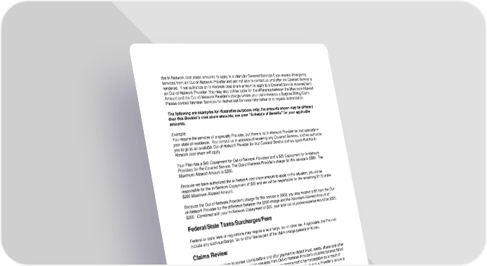 73 the In-Network cost share amounts to apply to a claim for Covered Services if you receive Emergency services from an Out-of-Network Provider and are not able to contact us until after the Covered Service is rendered. If we authorize an In-Network cost share amount to apply to a Covered Service received from an Out-of-Network Provider, You may also still be liable for the difference between the Maximum Allowed Amount and the Out-of-Network Provider’s charge unless your claim involves a Surprise Billing Claim. Please contact Member Services for Authorized Services information or to request authorization. The following are examples for illustrative purposes only; the amounts shown may be different than this Booklet’s cost share amounts; see your “Schedule of Benefits” for your applicable amounts. Example: You require the services of a specialty Provider; but there is no In-Network Provider for that specialty in your state of residence. You contact us in advance of receiving any Covered Services, and we authorize you to go to an available Out-of-Network Provider for that Covered Service and we agree that the In- Network cost share will apply. Your Plan has a $45 Copayment for Out-of-Network Providers and a $25 Copayment for In-Network Providers for the Covered Service. The Out-of-Network Provider’s charge for this service is $500. The Maximum Allowed Amount is $200. Because we have authorized the In-Network cost share amount to apply in this situation, you will be responsible for the In-Network Copayment of $25 and we will be responsible for the remaining $175 of the $200 Maximum Allowed Amount. Because the Out-of-Network Provider’s charge for this service is $500, you may receive a bill from the Out- of-Network Provider for the difference between the $500 charge and the Maximum Allowed Amount of $200. Combined with your In-Network Copayment of $25, your total out of pocket expense would be $325. Federal/State Taxes/Surcharges/Fees Federal or state laws or regulations may require a surcharge, tax or other fee. If applicable, the Plan will include any such surcharge, tax or other fee as part of the claim charge passed on to you. Claims Review Anthem has processes to review claims before and after payment to detect fraud, waste, abuse and other inappropriate activity. Members seeking services from Out-of-Network Providers could be balance billed by the Out-of-Network Provider for those services that are determined to be not payable as a result of these review processes. A claim may also be determined to be not payable due to a Provider's failure to submit medical records with the claims that are under review in these processes. Notice of Claim / Claims Forms / Proof of Loss After you get Covered Services, the Plan must receive written notice of your claim in order for benefits to be paid. • In-Network Providers will submit claims for you. They are responsible for ensuring that claims have the information the Plan needs to determine benefits. If the claim does not include enough information, we will ask them for more details, and they will be required to supply those details within certain timeframes. • Out-of-Network claims can be submitted by the Provider if the Provider is willing to file on your behalf. However, if the Provider is not submitting on your behalf, you will be required to submit the