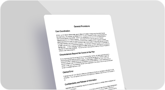 102 General Provisions Care Coordination Anthem, as the Claims Administrator, pays In-Network Providers in various ways to provide Covered Services to you. For example, sometimes Anthem may pay In-Network Providers a separate amount for each Covered Service they provide. Anthem may also pay them one amount for all Covered Services related to treatment of a medical condition. Other times, Anthem may pay a periodic, fixed pre- determined amount to cover the costs of Covered Services. In addition, Anthem may pay In-Network Providers financial incentives or other amounts to help improve quality of care and/or promote the delivery of health care services in a cost-efficient manner, or compensate In-Network Providers for coordination of Member care. In some instances, In-Network Providers may be required to make payment to us because they did not meet certain standards. You do not share in any payments made by In-Network Providers to Anthem under these programs. Circumstances Beyond the Control of the Plan If circumstances arise that are beyond the control of the Plan, the Plan will make a good-faith effort to ensure Covered Services are available to you. Circumstances that may occur, but are not within the control of the Plan, include but are not limited to, a major disaster, epidemic, war, when health care services covered under this Certificate are delayed or rendered impractical, or other events beyond our control. Under such circumstances, We will not be responsible for any delay or failure to give services due to lack of available Facilities or staff. Clerical Error A clerical error will never disturb or affect your coverage, as long as your coverage is valid under the rules of the Plan. This rule applies to any clerical error, regardless of whether it was the fault of the Employer or us. Confidentiality and Release of Information Applicable state and federal law requires the Claims Administrator to undertake efforts to safeguard your medical information. For informational purposes only, please be advised that a statement describing the Claims Administrator’s policies and procedures regarding the protection, use and disclosure of your medical information is available on the Claims Administrator’s website and can be furnished to you upon request by contacting the Claims Administrator’s Member Services department. Obligations that arise under state and federal law and policies and procedures relating to privacy that are referenced but not included in this Booklet are not part of the contract between the parties and do not give rise to contractual obligations. Conformity with Law Any term of the Plan which is in conflict with federal law, will hereby be automatically amended to conform with the minimum requirements of such laws. Contract with Anthem