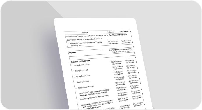21 Benefits In-Network Out-of-Network Out-of-Network Providers may also bill you for any charges over the Plan’s Maximum Allowed Amount. See “Therapy Services” for details on Benefit Maximums. • Prescription Drugs Administered in the Office (other than allergy serum) 20% Coinsurance after Deductible 40% Coinsurance after Deductible Orthotics See “Durable Medical Equipment (DME), Medical Devices, and Supplies.” Outpatient Facility Services • Facility Surgery Charge 20% Coinsurance after Deductible 40% Coinsurance after Deductible • Facility Surgery Lab 20% Coinsurance after Deductible 40% Coinsurance after Deductible • Facility Surgery X-ray 20% Coinsurance after Deductible 40% Coinsurance after Deductible • Ancillary Services 20% Coinsurance after Deductible 40% Coinsurance after Deductible • Doctor Surgery Charges 20% Coinsurance after Deductible 40% Coinsurance after Deductible • Other Doctor Charges (including Anesthesiologist, Pathologist, Radiologist, Surgical Assistant) 20% Coinsurance after Deductible 40% Coinsurance after Deductible • Other Facility Charges (for procedure rooms) 20% Coinsurance after Deductible 40% Coinsurance after Deductible • Mental Health / Substance Use Disorder Outpatient Facility Services (Partial Hospitalization Program / Intensive Outpatient Program) 20% Coinsurance after Deductible 40% Coinsurance after Deductible • Mental Health / Substance Use Disorder Outpatient Facility Provider Services (e.g., Doctor and other professional Providers in a Partial Hospitalization Program / Intensive Outpatient Program) 20% Coinsurance after Deductible 40% Coinsurance after Deductible • Shots/Injections (other than allergy serum) 20% Coinsurance after Deductible 40% Coinsurance after Deductible • Allergy Shots/Injections (including allergy serum) 20% Coinsurance after Deductible 40% Coinsurance after Deductible • Diagnostic Lab 20% Coinsurance after Deductible 40% Coinsurance after Deductible • Diagnostic X-ray 20% Coinsurance after Deductible 40% Coinsurance after Deductible • Other Diagnostic Tests: Hearing EKG, EEG etc. 20% Coinsurance after Deductible 40% Coinsurance after Deductible