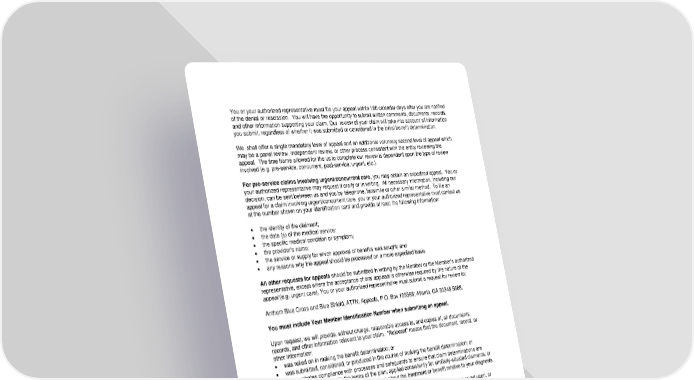 88 You or your authorized representative must file your appeal within 180 calendar days after you are notified of the denial or rescission. You will have the opportunity to submit written comments, documents, records, and other information supporting your claim. Our review of your claim will take into account all information you submit, regardless of whether it was submitted or considered in the initial benefit determination. We shall offer a single mandatory level of appeal and an additional voluntary second level of appeal which may be a panel review, independent review, or other process consistent with the entity reviewing the appeal. The time frame allowed for the us to complete our review is dependent upon the type of review involved (e.g. pre-service, concurrent, post-service, urgent, etc.). For pre-service claims involving urgent/concurrent care, you may obtain an expedited appeal. You or your authorized representative may request it orally or in writing. All necessary information, including our decision, can be sent between us and you by telephone, facsimile or other similar method. To file an appeal for a claim involving urgent/concurrent care, you or your authorized representative must contact us at the number shown on your identification card and provide at least the following information: • the identity of the claimant; • the date (s) of the medical service; • the specific medical condition or symptom; • the provider’s name; • the service or supply for which approval of benefits was sought; and • any reasons why the appeal should be processed on a more expedited basis. All other requests for appeals should be submitted in writing by the Member or the Member’s authorized representative, except where the acceptance of oral appeals is otherwise required by the nature of the appeal (e.g. urgent care). You or your authorized representative must submit a request for review to: Anthem Blue Cross and Blue Shield, ATTN: Appeals, P.O. Box 105568; Atlanta, GA 30348-5568. You must include Your Member Identification Number when submitting an appeal. Upon request, we will provide, without charge, reasonable access to, and copies of, all documents, records, and other information relevant to your claim. “Relevant” means that the document, record, or other information: • was relied on in making the benefit determination; or • was submitted, considered, or produced in the course of making the benefit determination; or • demonstrates compliance with processes and safeguards to ensure that claim determinations are made in accordance with the terms of the plan, applied consistently for similarly-situated claimants; or • is a statement of the plan’s policy or guidance about the treatment or benefit relative to your diagnosis. We will also provide you, free of charge, with any new or additional evidence considered, relied upon, or generated in connection with your claim. In addition, before you receive an adverse benefit determination on review based on a new or additional rationale, we will provide you, free of charge, with the rationale. For Out of State Appeals You have to file Provider appeals with the Host Plan. This means Providers must file appeals with the same plan to which the claim was filed. How Your Appeal will be Decided When we consider your appeal, we will not rely upon the initial benefit determination or, for voluntary second-level appeals, to the earlier appeal determination. The review will be conducted by an appropriate reviewer who did not make the initial determination and who does not work for the person who made the initial determination. A voluntary second-level review will be conducted by an appropriate reviewer who did not make the initial determination or the first-level appeal determination and who does not work for the person who made the initial determination or first-level appeal determination.