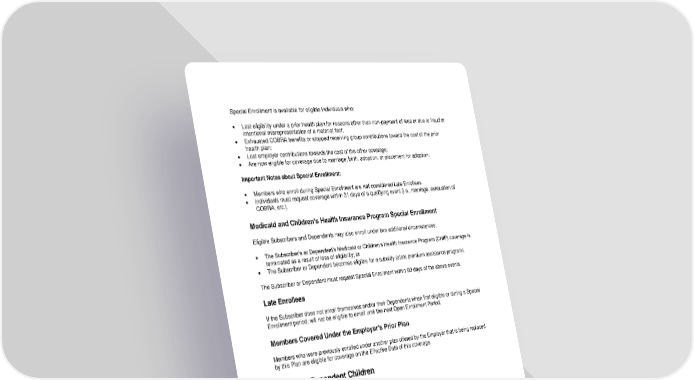 93 Special Enrollment is available for eligible individuals who: • Lost eligibility under a prior health plan for reasons other than non-payment of fees or due to fraud or intentional misrepresentation of a material fact; • Exhausted COBRA benefits or stopped receiving group contributions toward the cost of the prior health plan; • Lost employer contributions towards the cost of the other coverage; • Are now eligible for coverage due to marriage, birth, adoption, or placement for adoption. Important Notes about Special Enrollment: • Members who enroll during Special Enrollment are not considered Late Enrollees. • Individuals must request coverage within 31 days of a qualifying event (i.e., marriage, exhaustion of COBRA, etc.). Medicaid and Children’s Health Insurance Program Special Enrollment Eligible Subscribers and Dependents may also enroll under two additional circumstances: • The Subscriber’s or Dependent’s Medicaid or Children’s Health Insurance Program (CHIP) coverage is terminated as a result of loss of eligibility; or • The Subscriber or Dependent becomes eligible for a subsidy (state premium assistance program). The Subscriber or Dependent must request Special Enrollment within 60 days of the above events. Late Enrollees If the Subscriber does not enroll themselves and/or their Dependents when first eligible or during a Special Enrollment period, will not be eligible to enroll until the next Open Enrollment Period. Members Covered Under the Employer’s Prior Plan Members who were previously enrolled under another plan offered by the Employer that is being replaced by this Plan are eligible for coverage on the Effective Date of this coverage. Enrolling Dependent Children Newborn Children Newborn children are covered automatically from the moment of birth for a period of 31 days. To continue coverage beyond the 31 day period you should submit an application / change form to the Employer, within 31 days following the birth, to add the newborn to your Plan. Even if no additional Fees are required, you should still submit an application / change form to the Employer to add the newborn to your Plan, to make sure we have accurate records and are able to cover your claims. Newborn children coverage will be for injury or sickness, including: • The necessary care and treatment of medically diagnosed congenital defects and birth abnormalities; and • Medical and dental treatment (including orthodontic and oral surgery treatment) involved in the management of birth defects for cleft lip and cleft palate.