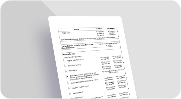 18 Benefits In-Network Out-of-Network • Respite Care No Copayment, Deductible, or Coinsurance No Copayment, Deductible, or Coinsurance Out-of-Network Providers may also bill you for any charges over the Plan’s Maximum Allowed Amount. Human Organ and Tissue Transplant (Bone Marrow / Stem Cell) Services Please see the separate summary later in this section. Inpatient Services Facility Room & Board Charge: • Hospital / Acute Care Facility 20% Coinsurance after Deductible 50% Coinsurance after Deductible • Skilled Nursing Facility 20% Coinsurance after Deductible 50% Coinsurance after Deductible • Rehabilitation 20% Coinsurance after Deductible 50% Coinsurance after Deductible • Skilled Nursing Facility / Rehabilitation Services (Includes Services in an Outpatient Day Rehabilitation Program) Benefit Maximum Combined 150 days per Benefit Period, In- and Out-of- Network combined • Mental Health / Substance Use Disorder Facility 20% Coinsurance after Deductible 50% Coinsurance after Deductible • Residential Treatment Center 20% Coinsurance after Deductible 50% Coinsurance after Deductible • Ancillary Services 20% Coinsurance after Deductible 50% Coinsurance after Deductible Doctor Services for: • General Medical Care / Evaluation and Management (E&M) 20% Coinsurance after Deductible 50% Coinsurance after Deductible • Surgery 20% Coinsurance after Deductible 50% Coinsurance after Deductible • Maternity 20% Coinsurance after Deductible 50% Coinsurance after Deductible • Mental Health / Substance Use Disorder Services 20% Coinsurance after Deductible 50% Coinsurance after Deductible Maternity and Reproductive Health Services • Maternity Visits (Global fee for the ObGyn’s prenatal, postnatal, and delivery services) 20% Coinsurance after Deductible 50% Coinsurance after Deductible • Inpatient Facility Services (Delivery) See “Inpatient Services”