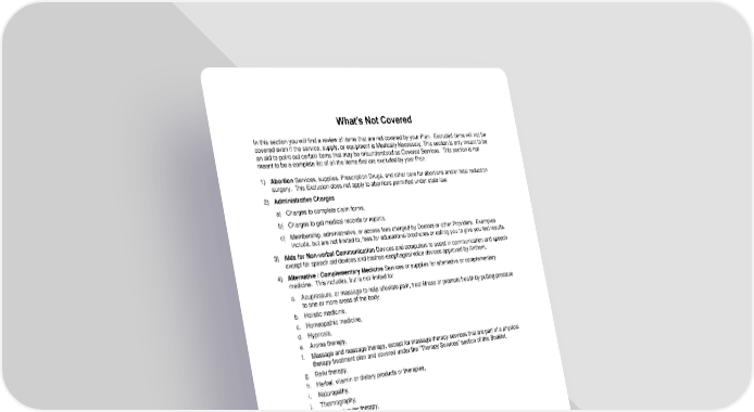 64 What’s Not Covered In this section you will find a review of items that are not covered by your Plan. Excluded items will not be covered even if the service, supply, or equipment is Medically Necessary. This section is only meant to be an aid to point out certain items that may be misunderstood as Covered Services. This section is not meant to be a complete list of all the items that are excluded by your Plan. 1) Abortion Services, supplies, Prescription Drugs, and other care for abortions and/or fetal reduction surgery. This Exclusion does not apply to abortions permitted under state law. 2) Administrative Charges a) Charges to complete claim forms, b) Charges to get medical records or reports, c) Membership, administrative, or access fees charged by Doctors or other Providers. Examples include, but are not limited to, fees for educational brochures or calling you to give you test results. 3) Aids for Non-verbal Communication Devices and computers to assist in communication and speech except for speech aid devices and tracheo-esophageal voice devices approved by Anthem. 4) Alternative / Complementary Medicine Services or supplies for alternative or complementary medicine. This includes, but is not limited to: a. Acupressure, or massage to help alleviate pain, treat illness or promote health by putting pressure to one or more areas of the body. b. Holistic medicine, c. Homeopathic medicine, d. Hypnosis, e. Aroma therapy, f. Massage and massage therapy, except for massage therapy services that are part of a physical therapy treatment plan and covered under the “Therapy Services” section of this Booklet, g. Reiki therapy, h. Herbal, vitamin or dietary products or therapies, i. Naturopathy, j. Thermography, k. Orthomolecular therapy, l. Contact reflex analysis, m. Bioenergetic synchronization technique (BEST), n. Iridology-study of the iris, o. Auditory integration therapy (AIT), p. Colonic irrigation, q. Magnetic innervation therapy, r. Electromagnetic therapy. 5) Applied Behavioral Treatment (including, but not limited to, Applied Behavior Analysis) for all indications except as described under Autism Services in the “What’s Covered” section unless otherwise required by law. 6) Autopsies Autopsies and post-mortem testing. 7) Before Effective Date or After Termination Date Charges for care you get before your Effective Date or after your coverage ends, except as written in this Plan.