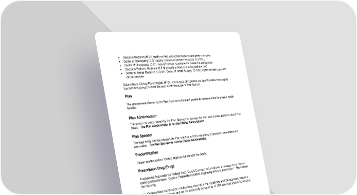 117 • Doctor of Medicine (M.D.) legally entitled to practice medicine and perform surgery, • Doctor of Osteopathy (D.O.) legally licensed to perform the duties of a D.O., • Doctor of Chiropractic (D.C.), legally licensed to perform the duties of a chiropractor, • Doctor of Podiatric Medicine (D.P.M.) legally entitled to practice podiatry, and • Doctor of Dental Medicine (D.D.M.), Doctor of Dental Surgery (D.D.S.), legally entitled to provide dental services. Optometrists, Clinical Psychologists (PhD), and surgical chiropodists are also Providers when legally licensed and giving Covered Services within the scope of their licenses. Plan The arrangement chosen by the Plan Sponsor to fund and provide for delivery of the Employer’s health benefits. Plan Administrator The person or entity named by the Plan Sponsor to manage the Plan and answer questions about Plan details. The Plan Administrator is not the Claims Administrator. Plan Sponsor The legal entity that has adopted the Plan and has authority regarding its operation, amendment and termination. The Plan Sponsor is not the Claims Administrator. Precertification Please see the section “Getting Approval for Benefits” for details. Prescription Drug (Drug) A substance, that under the Federal Food, Drug & Cosmetic Act, must bear a message on its original packing label that says, “Caution: Federal law prohibits dispensing without a prescription.” This includes the following: 1) Compounded (combination) medications, when all of the ingredients are FDA-approved, require a prescription to dispense, and are not essentially the same as an FDA-approved product from a drug manufacturer. 2) Insulin, diabetic supplies, and syringes. Primary Care Physician (“PCP”) A Physician who gives or directs health care services for you. The Physician may work in family practice, general practice, internal medicine, pediatrics, obstetrics/gynecology, geriatrics or any other practice allowed by the Plan. Primary Care Provider A Physician, nurse practitioner, clinical nurse specialist, physician assistant, or any other Provider licensed by law and allowed under the Plan, who gives, directs, or helps you get a range of health care services.