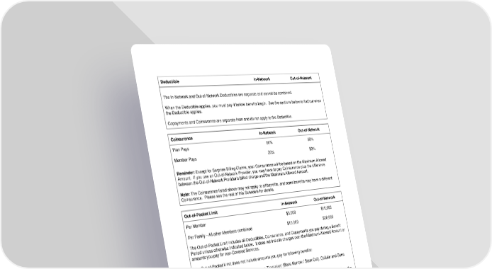 13 Deductible In-Network Out-of-Network The In-Network and Out-of-Network Deductibles are separate and cannot be combined. When the Deductible applies, you must pay it before benefits begin. See the sections below to find out when the Deductible applies. Copayments and Coinsurance are separate from and do not apply to the Deductible. Coinsurance In-Network Out-of-Network Plan Pays 80% 50% Member Pays 20% 50% Reminder: Except for Surprise Billing Claims, your Coinsurance will be based on the Maximum Allowed Amount. If you use an Out-of-Network Provider, you may have to pay Coinsurance plus the difference between the Out-of-Network Provider’s billed charge and the Maximum Allowed Amount. Note: The Coinsurance listed above may not apply to all benefits, and some benefits may have a different Coinsurance. Please see the rest of this Schedule for details. Out-of-Pocket Limit In-Network Out-of-Network Per Member $5,000 $10,000 Per Family - All other Members combined $10,000 $20,000 The Out-of-Pocket Limit includes all Deductibles, Coinsurance, and Copayments you pay during a Benefit Period unless otherwise indicated below. It does not include charges over the Maximum Allowed Amount or amounts you pay for non-Covered Services. The Out-of-Pocket Limit does not include amounts you pay for following benefits: • Out-of-Network Human Organ and Tissue Transplant (Bone Marrow / Stem Cell), Cellular and Gene Therapy Services. No one person covered under a family plan will pay more than their individual Out-of-Pocket Limit. Once the Out-of-Pocket Limit is satisfied, you will not have to pay any additional Deductibles, Coinsurance, or Copayments for the rest of the Benefit Period, except for the services listed above. The In-Network and Out-of-Network Out-of-Pocket Limits are separate and do not apply toward each other. Important Notice about Your Cost Shares In certain cases, if a Provider is paid amounts that are your responsibility, such as Deductibles, Copayments or Coinsurance, such amounts may be collected directly from you. You agree that we, on behalf of the Employer, have the right to collect such amounts from you. The tables below outline the Plan’s Covered Services and the cost share(s) you must pay. In many spots you will see the statement, “Benefits are based on the setting in which Covered Services are received.” In