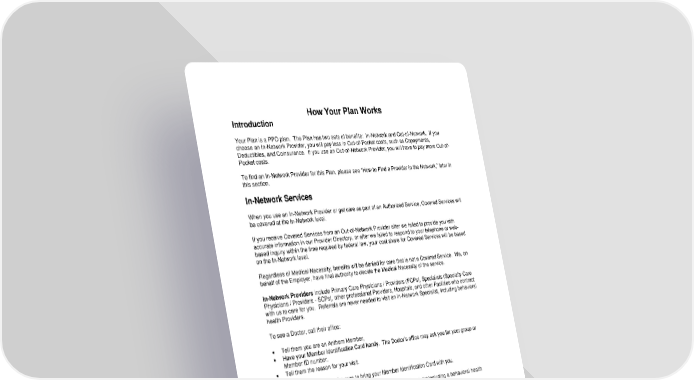 29 How Your Plan Works Introduction Your Plan is a PPO plan. The Plan has two sets of benefits: In-Network and Out-of-Network. If you choose an In-Network Provider, you will pay less in Out-of-Pocket costs, such as Copayments, Deductibles, and Coinsurance. If you use an Out-of-Network Provider, you will have to pay more Out-of- Pocket costs. To find an In-Network Provider for this Plan, please see “How to Find a Provider in the Network,” later in this section. In-Network Services When you use an In-Network Provider or get care as part of an Authorized Service, Covered Services will be covered at the In-Network level. If you receive Covered Services from an Out-of-Network Provider after we failed to provide you with accurate information in our Provider Directory, or after we failed to respond to your telephone or web- based inquiry within the time required by federal law, your cost share for Covered Services will be based on the In-Network level. Regardless of Medical Necessity, benefits will be denied for care that is not a Covered Service. We, on behalf of the Employer, have final authority to decide the Medical Necessity of the service. In-Network Providers include Primary Care Physicians / Providers (PCPs), Specialists (Specialty Care Physicians / Providers - SCPs), other professional Providers, Hospitals, and other Facilities who contract with us to care for you. Referrals are never needed to visit an In-Network Specialist, including behavioral health Providers. To see a Doctor, call their office: • Tell them you are an Anthem Member, • Have your Member Identification Card handy. The Doctor’s office may ask you for your group or Member ID number. • Tell them the reason for your visit. When you go to the office, be sure to bring your Member Identification Card with you. If you need to see a Specialist, you can visit any In-Network Specialist including a behavioral health Provider. You do not have to get a Referral. For services from In-Network Providers: 1. You will not need to file claims. In-Network Providers will file claims for Covered Services for you. (You will still need to pay any Coinsurance, Copayments, and/or Deductibles that apply.) You may be billed by your In-Network Provider(s) for any non-Covered Services you get or when you have not followed the terms of this Booklet. 2. Precertification will be done by the In-Network Provider. (See the “Getting Approval for Benefits” section for further details.) Please read the “Claims Payment” section for additional information on Authorized Services.
