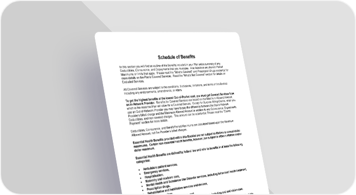 12 Schedule of Benefits In this section you will find an outline of the benefits included in your Plan and a summary of any Deductibles, Coinsurance, and Copayments that you must pay. Also listed are any Benefit Period Maximums or limits that apply. Please read the "What’s Covered" and Prescription Drugs section(s) for more details on the Plan’s Covered Services. Read the “What’s Not Covered” section for details on Excluded Services. All Covered Services are subject to the conditions, Exclusions, limitations, and terms of this Booklet including any endorsements, amendments, or riders. To get the highest benefits at the lowest Out-of-Pocket cost, you must get Covered Services from an In-Network Provider. Benefits for Covered Services are based on the Maximum Allowed Amount, which is the most the Plan will allow for a Covered Service. Except for Surprise Billing Claims, when you use an Out-of-Network Provider you may have to pay the difference between the Out-of-Network Provider’s billed charge and the Maximum Allowed Amount in addition to any Coinsurance, Copayments, Deductibles, and non-covered charges. This amount can be substantial. Please read the “Claims Payment” section for more details. Deductibles, Coinsurance, and Benefit Period Maximums are calculated based upon the Maximum Allowed Amount, not the Provider’s billed charges. Essential Health Benefits provided within this Booklet are not subject to lifetime or annual dollar maximums. Certain non-essential health benefits, however, are subject to either a lifetime and/or dollar maximum. Essential Health Benefits are defined by federal law and refer to benefits in at least the following categories: • Ambulatory patient services, • Emergency services, • Hospitalization, • Maternity and newborn care, • Mental Health and Substance Use Disorder services, including behavioral health treatment, • Prescription drugs, • Rehabilitative and habilitative services and devices, • Laboratory services, • Preventive and wellness services, and • Chronic disease management and pediatric services, including oral and vision care. Such benefits shall be consistent with those set forth under the Patient Protection and Affordable Care Act of 2010 and any regulations issued pursuant thereto. Benefit Period Calendar Year Dependent Age Limit To the end of the month in which the child attains age 26. Deductible In-Network Out-of-Network Per Member $1,000 $2,000 Per Family - All other Members combined $2,000 $4,000