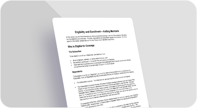 92 Eligibility and Enrollment – Adding Members In this section you will find information on who is eligible for coverage under this Plan and when Members can be added to your coverage. Eligibility requirements are described in general terms below. For more specific information, please see your Human Resources or Benefits Department. Who is Eligible for Coverage The Subscriber To be eligible to enroll as a Subscriber, the individual must: • Be an employee, member, or retiree of the Employer, and • Be entitled to participate in the benefit Plan arranged by the Employer; • Have satisfied any probationary or waiting period established by the Employer and (for non-retirees) and perform the duties of your principal occupation for the Employer. Dependents To be eligible to enroll as a Dependent, you must be listed on the enrollment form completed by the Subscriber, meet all Dependent eligibility criteria established by the Employer, and be one of the following: • The Subscriber's spouse. For information on spousal eligibility, please contact the Employer. • The Subscriber’s Domestic Partner, if Domestic Partner coverage is allowed under the Group’s Plan. Please contact the Group to determine if Domestic Partners are eligible under this Plan. Domestic Partner, or Domestic Partnership means a person of the same or opposite sex who has signed the Domestic Partner Affidavit certifying that he or she is the Subscriber’s sole Domestic Partner and has been for 12 months or more; he or she is mentally competent; he or she is not related to the Subscriber by blood closer than permitted by state law for marriage; he or she is not married to anyone else; and he or she is financially interdependent with the Subscriber. For purposes of this Plan, a Domestic Partner shall be treated the same as a spouse, and a Domestic Partner’s child, adopted child, or child for whom a Domestic Partner has legal guardianship shall be treated the same as any other child. Any federal or state law that applies to a Member who is a spouse or child under this Plan shall also apply to a Domestic Partner or a Domestic Partner’s child who is a Member under this Plan. This includes but is not limited to, COBRA, FMLA, and COB. A Domestic Partner’s or a Domestic Partner’s child’s coverage ends on the date of dissolution of the Domestic Partnership. To apply for coverage as Domestic Partners, both the Subscriber and the Domestic Partner must complete and sign the Affidavit of Domestic Partnership in addition to the Enrollment Application and must meet all criteria stated in the Affidavit. Signatures must be witnessed and notarized by a notary public. The Employer reserves the right to make the ultimate decision in determining eligibility of the Domestic Partner. • The Subscriber’s or the Subscriber’s spouse’s children, including natural children, stepchildren, newborn and legally adopted children and children who the Employer has determined are covered under a Qualified Medical Child Support Order as defined by ERISA or any applicable state law. • Children for whom the Subscriber or the Subscriber’s spouse is a legal guardian or as otherwise required by law.
