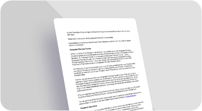 63 to verify Prescription Drug coverage, to find out which drugs are covered under this section and if any drug edits apply. Please refer to the section “Getting Approval for Benefits” for more details. If precertification is denied you have the right to file a Grievance as outlined in the “Your Right To Appeal” section of this Booklet. Designated Pharmacy Provider Anthem, on behalf of the Employer, in its discretion, may establish one or more Designated Pharmacy Provider programs which provide specific pharmacy services (including shipment of Prescription Drugs) to Members. An In-Network Provider is not necessarily a Designated Pharmacy Provider. To be a Designated Pharmacy Provider, the In-Network Provider must have signed a Designated Pharmacy Provider Agreement with Anthem. You or your Provider can contact Member Services to learn which Pharmacy or Pharmacies are part of a Designated Pharmacy Provider program. For Prescription Drugs that are shipped to you or your Provider and administered in your Provider’s office, you and your Provider are required to order from a Designated Pharmacy Provider. A Patient Care coordinator will work with you and your Provider to obtain Precertification and to assist shipment to your Provider’s office. The Plan may also be required to use a Designated Pharmacy Provider to obtain Prescription Drugs for treatment of certain clinical conditions such as Hemophilia. The Plan reserves the right to modify the list of Prescription Drugs as well as the setting and/or level of care in which the care is provided to you. Anthem may, from time to time, change with or without advance notice, the Designated Pharmacy Provider for a Drug, if in the Claims Administrator’s discretion, such change can help provide cost effective, value based and/or quality services. If You are required to use a Designated Pharmacy Provider and you choose not to obtain your Prescription Drug from a Designated Pharmacy Provider, coverage will be provided at the Out-of-Network level. You can get the list of the Prescription Drugs covered under this section by calling Member Services at the phone number on the back of your Identification Card or check our website at www.anthem.com. Therapeutic Equivalents Therapeutic equivalents is a program that tells you and your Doctor about alternatives to certain prescribed Drugs. We may contact you and your Doctor to make you aware of these choices. Only you and your Doctor can determine if the therapeutic equivalent is right for you. For questions or issues about therapeutic Drug equivalents call Member Services at the phone number on the back of your Identification Card.