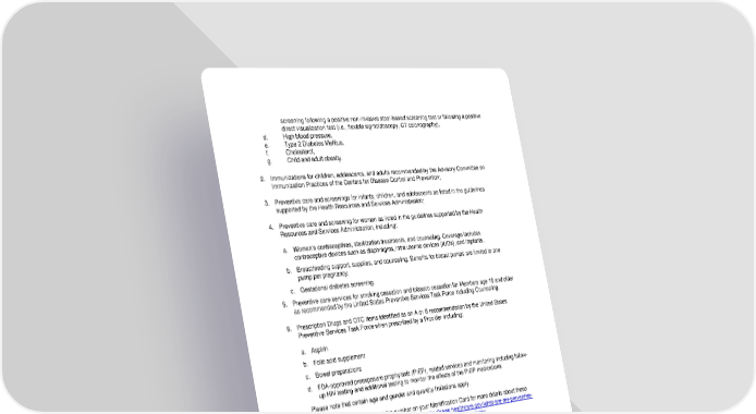 55 screening following a positive non-invasive stool-based screening test or following a positive direct visualization test (i.e., flexible sigmoidoscopy, CT colonography), d. High blood pressure, e. Type 2 Diabetes Mellitus, f. Cholesterol, g. Child and adult obesity. 2. Immunizations for children, adolescents, and adults recommended by the Advisory Committee on Immunization Practices of the Centers for Disease Control and Prevention; 3. Preventive care and screenings for infants, children, and adolescents as listed in the guidelines supported by the Health Resources and Services Administration; 4. Preventive care and screening for women as listed in the guidelines supported by the Health Resources and Services Administration, including: a. Women’s contraceptives, sterilization treatments, and counseling. Coverage includes contraceptive devices such as diaphragms, intra uterine devices (IUDs), and implants. b. Breastfeeding support, supplies, and counseling. Benefits for breast pumps are limited to one pump per pregnancy. c. Gestational diabetes screening. 5. Preventive care services for smoking cessation and tobacco cessation for Members age 18 and older as recommended by the United States Preventive Services Task Force including Counseling. 6. Prescription Drugs and OTC items identified as an A or B recommendation by the United States Preventive Services Task Force when prescribed by a Provider including: a. Aspirin b. Folic acid supplement c. Bowel preparations d. FDA-approved preexposure prophylaxis (PrEP), related services and monitoring including follow- up HIV testing and additional testing to monitor the effects of the PrEP medications. Please note that certain age and gender and quantity limitations apply. You may call Member Services at the number on your Identification Card for more details about these services or view the federal government’s websites, http://www.healthcare.gov/what-are-my-preventive- care-benefits, http://www.ahrq.gov, and http://www.cdc.gov/vaccines/recs/acip/. In addition to the Federal requirements above, preventive coverage also includes the following Covered Services: • Routine screening mammograms. • Routine prostate specific antigen testing. • Routine colorectal cancer examination and related laboratory tests. • Follow-up colonoscopy to a colorectal cancer screening test assigned either an "A" or "B" grade by the United States Preventive Services Task Force that was positive.