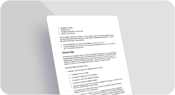 41 • Occupational Therapy; • Chiropractic care; • Osteopathic manipulative treatment; and • Athletic Trainer Services. See the sections “Athletic Trainer Services”, “Therapy Services” and “Prescription Drug Benefits at a Retail or Home Delivery (Mail Order) Pharmacy” for further details on the benefits for these services. As used in this section “Chronic pain" means pain that: • persists beyond the usual course of an acute disease or healing of an injury; or • may be associated with an acute or chronic pathologic process that causes continuous or intermittent pain for a period of months or years. Clinical Trials Benefits include coverage for services, such as routine patient care costs, given to you as a participant in an approved clinical trial if the services are Covered Services under this Plan. An “approved clinical trial” means a phase I, phase II, phase III, or phase IV clinical trial that studies the prevention, detection, or treatment of cancer or other life-threatening conditions. The term life-threatening condition means any disease or condition from which death is likely unless the disease or condition is treated. Benefits are limited to the following trials: 1. Federally funded trials approved or funded by one of the following: a. The National Institutes of Health. b. The Centers for Disease Control and Prevention. c. The Agency for Health Care Research and Quality. d. The Centers for Medicare & Medicaid Services. e. Cooperative group or center of any of the entities described in (a) through (d) or the Department of Defense or the Department of Veterans Affairs. f. A qualified non-governmental research entity identified in the guidelines issued by the National Institutes of Health for center support grants. g. Any of the following in i-iii below if the study or investigation has been reviewed and approved through a system of peer review that the Secretary of Health and Human Services determines 1) to be comparable to the system of peer review of studies and investigations used by the National Institutes of Health, and 2) assures unbiased review of the highest scientific standards by qualified individuals who have no interest in the outcome of the review. i. The Department of Veterans Affairs. ii. The Department of Defense. iii. The Department of Energy. 2. Studies or investigations done as part of an investigational new drug application reviewed by the Food and Drug Administration; 3. Studies or investigations done for drug trials, which are exempt from the investigational new drug application. Your Plan may require you to use an In-Network Provider to maximize your benefits.