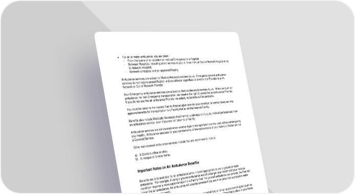 39 • For air or water ambulance, you are taken: - From the scene of an accident or medical Emergency to a Hospital; - Between Hospitals, including when we require you to move from an Out-of-Network Hospital to an In-Network Hospital; - Between a Hospital and an approved Facility. Ambulance services are subject to Medical Necessity reviews by us. Emergency ground ambulance services do not require precertification and are allowed regardless of whether the Provider is an In- Network or Out-of-Network Provider. Non-Emergency ambulance services are subject to Medical Necessity reviews by us. When using an air ambulance, for non-Emergency transportation, we reserve the right to select the air ambulance Provider. If you do not use the air ambulance Provider we select, no benefits will be available. You must be taken to the nearest Facility that can give care for your condition. In certain cases we may approve benefits for transportation to a Facility that is not the nearest Facility. Benefits also include Medically Necessary treatment of a sickness or injury by medical professionals from an ambulance service, even if you are not taken to a Facility. Ambulance services are not covered when another type of transportation can be used without endangering your health. Ambulance services for your convenience or the convenience of your family or Doctor are not a Covered Service. Other non-covered ambulance services include, but are not limited to, trips to: a) A Doctor’s office or clinic; b) A morgue or funeral home. Important Notes on Air Ambulance Benefits Benefits are only available for air ambulance when it is not appropriate to use a ground or water ambulance. For example, if using a ground ambulance would endanger your health and your medical condition requires a more rapid transport to a Facility than the ground ambulance can provide, the Plan will cover the air ambulance. Air ambulance will also be covered if you are in an area that a ground or water ambulance cannot reach. Air ambulance will not be covered if you are taken to a Hospital that is not an acute care Hospital (such as a Skilled Nursing Facility or a rehabilitation facility), or if you are taken to a Physician’s office or your home. Hospital to Hospital Transport If you are moving from one Hospital to another, air ambulance will only be covered if using a ground ambulance would endanger your health and if the Hospital that first treats cannot give you the medical services you need. Certain specialized services are not available at all Hospitals. For example, burn care, cardiac care, trauma care, and critical care are only available at certain Hospitals. To be covered, you must be taken to the closest Hospital that can treat you. Coverage is not available for air ambulance transfers simply because you, your family, or your Provider prefers a specific Hospital or Physician. Athletic Trainer Services Your Plan covers services from an Athletic Trainer who is licensed under applicable state law and provides physical medicine and rehabilitative services within their scope of practice.
