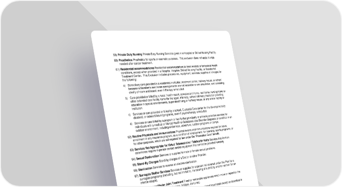 69 59) Private Duty Nursing Private Duty Nursing Services given in a Hospital or Skilled Nursing Facility. 60) Prosthetics Prosthetics for sports or cosmetic purposes. This exclusion does not apply to wigs needed after cancer treatment. 61) Residential accommodations Residential accommodations to treat medical or behavioral health conditions, except when provided in a Hospital, Hospice, Skilled Nursing Facility, or Residential Treatment Center. This Exclusion includes procedures, equipment, services, supplies or charges for the following: a) Domiciliary care provided in a residential institution, treatment center, halfway house, or school because a Member’s own home arrangements are not available or are unsuitable, and consisting chiefly of room and board, even if therapy is included. b) Care provided or billed by a hotel, health resort, convalescent home, rest home, nursing home or other extended care facility home for the aged, infirmary, school infirmary, institution providing education in special environments, supervised living or halfway house, or any similar facility or institution. c) Services or care provided or billed by a school, Custodial Care center for the developmentally disabled, or outward-bound programs, even if psychotherapy is included. d) Services or care billed by a program or facility that principally or primarily provides services for individuals with a medical or Mental Health or Substance Use Disorder diagnosis or condition in an outdoor environment, including wilderness, adventure, outdoor programs or camps. 62) Routine Physicals and Immunizations Physical exams and immunizations required for travel, enrollment in any insurance program, as a condition of employment, for licensing, sports programs, or for other purposes, which are not required by law under the “Preventive Care” benefit. 63) Services Not Appropriate for Virtual Telemedicine / Telehealth Visits Services that Anthem determines require in-person contact and/or equipment that cannot be provided remotely. 64) Sexual Dysfunction Services or supplies for male or female sexual problems. 65) Stand-By Charges Stand-by charges of a Doctor or other Provider. 66) Sterilization Services to reverse an elective sterilization. 67) Surrogate Mother Services Services or supplies for a person not covered under this Plan for a surrogate pregnancy (including, but not limited to, the bearing of a child by another woman for an infertile couple). 68) Temporomandibular Joint Treatment Fixed or removable appliances which move or reposition the teeth, fillings, or prosthetics (crowns, bridges, dentures). 69) Travel Costs Mileage, lodging, meals, and other Member-related travel costs except as described in this Plan. 70) Vein Treatment Treatment of varicose veins or telangiectatic dermal veins (spider veins) by any method (including sclerotherapy or other surgeries) for cosmetic purposes. 71) Vision Services Vision services not described as Covered Services in this Booklet. 72) Waived Cost-Shares Out-of-Network For any service for which you are responsible under the terms of this Plan to pay a Copayment, Coinsurance or Deductible, and the Copayment, Coinsurance or Deductible is waived by an Out-of-Network Provider. 73) Weight Loss Programs Programs, whether or not under medical supervision, unless listed as covered in this Booklet. This Exclusion includes, but is not limited to, commercial weight loss programs (Weight Watchers, Jenny Craig, LA Weight Loss) and fasting programs.