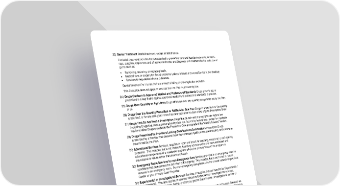 66 23) Dental Treatment Dental treatment, except as listed below. Excluded treatment includes but is not limited to preventive care and fluoride treatments; dental X- rays, supplies, appliances and all associated costs; and diagnosis and treatment for the teeth, jaw or gums such as: • Removing, restoring, or replacing teeth; • Medical care or surgery for dental problems (unless listed as a Covered Service in this Booklet); • Services to help dental clinical outcomes. Dental treatment for injuries that are a result of biting or chewing is also excluded. This Exclusion does not apply to services that the Plan must cover by law. 24) Drugs Contrary to Approved Medical and Professional Standards Drugs given to you or prescribed in a way that is against approved medical and professional standards of practice. 25) Drugs Over Quantity or Age Limits Drugs which are over any quantity or age limits set by the Plan or us. 26) Drugs Over the Quantity Prescribed or Refills After One Year Drugs in amounts over the quantity prescribed, or for any refill given more than one year after the date of the original Prescription Order. 27) Drugs That Do Not Need a Prescription Drugs that do not need a prescription by federal law (including Drugs that need a prescription by state law, but not by federal law), except for injectable insulin or other Drugs provided in the Preventive Care paragraph of the "What’s Covered" section. 28) Drugs Prescribed by Providers Lacking Qualifications/Certifications Prescription Drugs prescribed by a Provider that does not have the necessary qualifications and including certifications as determined by the Plan. 29) Educational Services Services, supplies or room and board for teaching, vocational, or self-training purposes. This includes, but is not limited to, boarding schools and/or the room and board and educational components of a residential program where the primary focus of the program is educational in nature rather than treatment based. 30) Emergency Room Services for non-Emergency Care Services provided in an emergency room for conditions that do not meet the definition of Emergency. This includes, but is not limited to, suture removal in an emergency room. For non-emergency care please use the closest network Urgent Care Center or your Primary Care Physician. 31) Experimental or Investigational Services Services or supplies that are found to be Experimental / Investigational. This also applies to services related to Experimental / Investigational services, whether you get them before, during, or after you get the Experimental / Investigational service or supply. The fact that a service or supply is the only available treatment will not make it Covered Service if we conclude it is Experimental / Investigational. Details on the criteria we use to determine if a Service is Experimental or Investigational is outlined below. 32) Eyeglasses and Contact Lenses Eyeglasses and contact lenses to correct your eyesight unless listed as covered in this Booklet. This Exclusion does not apply to lenses needed after a covered eye surgery. 33) Eye Exercises Orthoptics and vision therapy. 34) Eye Surgery Eye surgery to fix errors of refraction, such as near-sightedness. This includes, but is not limited to, LASIK, radial keratotomy or keratomileusis, and excimer laser refractive keratectomy. 35) Family Members Services prescribed, ordered, referred by or given by a member of your immediate family, including your spouse, child, brother, sister, parent, in-law, or self.