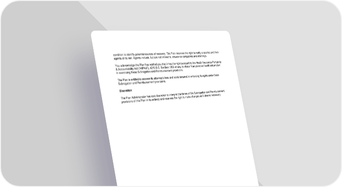 87 condition to identify potential sources of recovery. The Plan reserves the right to notify all parties and their agents of its lien. Agents include, but are not limited to, insurance companies and attorneys. You acknowledge the Plan has notified you that it has the right pursuant to the Health Insurance Portability & Accountability Act (“HIPAA”), 42 U.S.C. Section 1301 et seq, to share Your personal health information in exercising these Subrogation and Reimbursement provisions. The Plan is entitled to recover its attorney’s fees and costs incurred in enforcing its rights under these Subrogation and Reimbursement provisions. Discretion The Plan Administrator has sole discretion to interpret the terms of the Subrogation and Reimbursement provisions of this Plan in its entirety and reserves the right to make changes as it deems necessary.