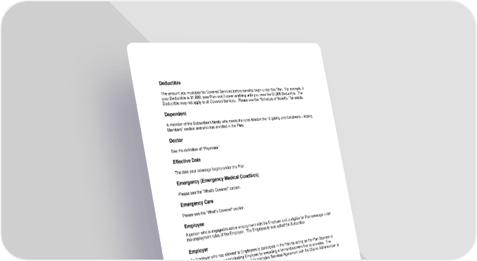 113 Deductible The amount you must pay for Covered Services before benefits begin under this Plan. For example, if your Deductible is $1,000, your Plan won’t cover anything until you meet the $1,000 Deductible. The Deductible may not apply to all Covered Services. Please see the “Schedule of Benefits ” for details. Dependent A member of the Subscriber’s family who meets the rules listed in the “Eligibility and Enrollment – Adding Members” section and who has enrolled in the Plan. Doctor See the definition of “Physician.” Effective Date The date your coverage begins under this Plan. Emergency (Emergency Medical Condition) Please see the "What’s Covered" section. Emergency Care Please see the "What’s Covered" section. Employee A person who is engaged in active employment with the Employer and is eligible for Plan coverage under the employment rules of the Employer. The Employee is also called the Subscriber. Employer An Employer who has allowed its Employees to participate in the Plan by acting as the Plan Sponsor or adopting the Plan as a participating Employer by executing a formal document that so provides. The Employer or other organization has an Administrative Services Agreement with the Claims Administrator to administer this Plan. Excluded Services (Exclusion) Health care services your Plan doesn’t cover. Experimental or Investigational (Experimental / Investigational) Any Drug, biologic, device, Diagnostic, product, equipment, procedure, treatment, service, or supply used in or directly related to the diagnosis, evaluation, or treatment of a disease, injury, illness, or other health condition which We determine to be unproven. For how this is determined, see the “What’s Not Covered” section. Facility