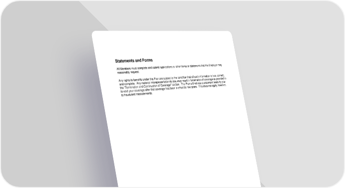 96 Statements and Forms All Members must complete and submit applications or other forms or statements that the Employer may reasonably request. Any rights to benefits under this Plan are subject to the condition that all such information is true, correct, and complete. Any material misrepresentation by you may result in termination of coverage as provided in the "Termination and Continuation of Coverage" section. The Plan will not use a statement made by you to void your coverage after that coverage has been in effect for two years. This does not apply, however, to fraudulent misstatements.