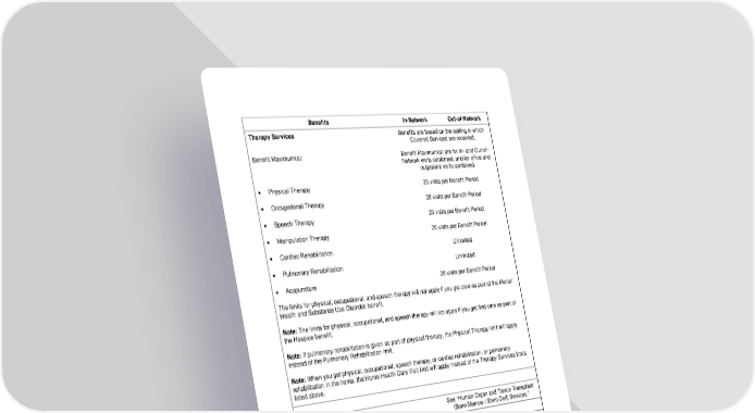 24 Benefits In-Network Out-of-Network Therapy Services Benefits are based on the setting in which Covered Services are received. Benefit Maximum(s): Benefit Maximum(s) are for In- and Out-of- Network visits combined, and for office and outpatient visits combined. • Physical Therapy 20 visits per Benefit Period • Occupational Therapy 20 visits per Benefit Period • Speech Therapy 20 visits per Benefit Period • Manipulation Therapy 20 visits per Benefit Period • Cardiac Rehabilitation Unlimited • Pulmonary Rehabilitation Unlimited • Acupuncture 20 visits per Benefit Period The limits for physical, occupational, and speech therapy will not apply if you get care as part of the Mental Health and Substance Use Disorder benefit. Note: The limits for physical, occupational, and speech therapy will not apply if you get that care as part of the Hospice benefit. Note: If pulmonary rehabilitation is given as part of physical therapy, the Physical Therapy limit will apply instead of the Pulmonary Rehabilitation limit. Note: When you get physical, occupational, speech therapy, or cardiac rehabilitation, or pulmonary rehabilitation in the home, the Home Health Care Visit limit will apply instead of the Therapy Services limits listed above. Transplant Services See “Human Organ and Tissue Transplant (Bone Marrow / Stem Cell) Services.” Urgent Care Services (Office & Home* Visits) *Home visits are not the same as Home Health Care. For Home Health Care benefits please see the "Home Health Care" section. • Urgent Care Visit Charge 20% Coinsurance after Deductible 50% Coinsurance after Deductible • Allergy Testing 20% Coinsurance after Deductible 50% Coinsurance after Deductible • Shots / Injections (other than allergy serum) 20% Coinsurance after Deductible 50% Coinsurance after Deductible