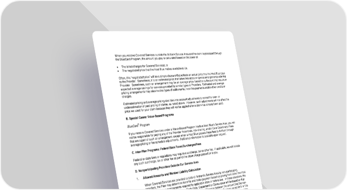 77 When you receive Covered Services outside the Anthem Service Area and the claim is processed through the BlueCard Program, the amount you pay is calculated based on the lower of: • The billed charges for Covered Services; or • The negotiated price that the Host Blue makes available to Us. Often, this “negotiated price” will be a simple discount that reflects an actual price that the Host Blue pays to the Provider. Sometimes, it is an estimated price that takes into account special arrangements with that Provider. Sometimes, such an arrangement may be an average price, based on a discount that results in expected average savings for services provided by similar types of Providers. Estimated and average pricing arrangements may also involve types of settlements, incentive payments and/or other credits or charges. Estimated pricing and average pricing also take into account adjustments to correct for over- or underestimation of past pricing of claims, as noted above. However, such adjustments will not affect the price we used for your claim because they will not be applied after a claim has already been paid. B. Special Cases: Value-Based Programs BlueCard® Program If you receive Covered Services under a Value-Based Program inside a Host Blue’s Service Area, you will not be responsible for paying any of the Provider Incentives, risk-sharing, and/or Care Coordinator Fees that are a part of such an arrangement, except when a Host Blue passes these fees to Anthem through average pricing or fee schedule adjustments. Additional information is available upon request. C. Inter-Plan Programs: Federal/State Taxes/Surcharges/Fees Federal or state laws or regulations may require a surcharge, tax or other fee. If applicable, we will include any such surcharge, tax or other fee as part of the claim charge passed on to you. D. Nonparticipating Providers Outside Our Service Area 1. Allowed Amounts and Member Liability Calculation When Covered Services are provided outside of Anthem’s Service Area by non-participating providers, the Plan may determine benefits and make payment based on pricing from either the Host Blue or the pricing arrangements required by applicable state or federal law. In these situations, the amount you pay for such services as Deductible, Copayment or Coinsurance will be based on that allowed amount. Also, you may be responsible for the difference between the amount that the non- participating provider bills and the payment we will make for the Covered Services as set forth in this paragraph. Federal or state law, as applicable, will govern payments for Out-of-Network Emergency services. 2. Exceptions In certain situations, the Plan may use other pricing methods, such as billed charges or the pricing it would use if the healthcare services had been obtained within the Anthem Service Area, or a special negotiated price to determine the amount the Plan will pay for services provided by nonparticipating providers. In these situations, you may be liable for the difference between the amount that the nonparticipating provider bills and the payment we make for the Covered Services as set forth in this paragraph.