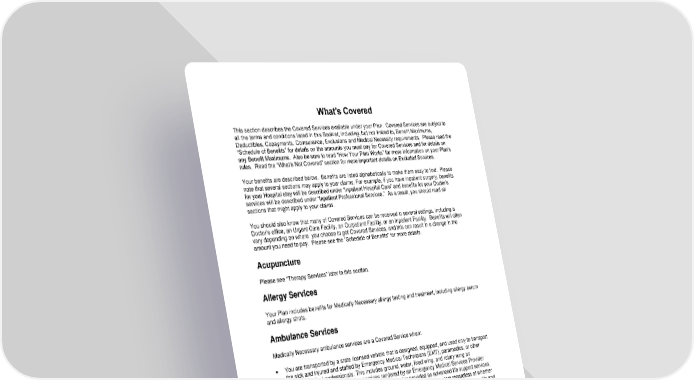 38 What’s Covered This section describes the Covered Services available under your Plan. Covered Services are subject to all the terms and conditions listed in this Booklet, including, but not limited to, Benefit Maximums, Deductibles, Copayments, Coinsurance, Exclusions and Medical Necessity requirements. Please read the “Schedule of Benefits” for details on the amounts you must pay for Covered Services and for details on any Benefit Maximums. Also be sure to read “How Your Plan Works” for more information on your Plan’s rules. Read the “What’s Not Covered” section for more important details on Excluded Services. Your benefits are described below. Benefits are listed alphabetically to make them easy to find. Please note that several sections may apply to your claims. For example, if you have inpatient surgery, benefits for your Hospital stay will be described under “Inpatient Hospital Care” and benefits for your Doctor’s services will be described under “Inpatient Professional Services.” As a result, you should read all sections that might apply to your claims. You should also know that many of Covered Services can be received in several settings, including a Doctor’s office, an Urgent Care Facility, an Outpatient Facility, or an Inpatient Facility. Benefits will often vary depending on where you choose to get Covered Services, and this can result in a change in the amount you need to pay. Please see the “Schedule of Benefits” for more details. Acupuncture Please see “Therapy Services” later in this section. Allergy Services Your Plan includes benefits for Medically Necessary allergy testing and treatment, including allergy serum and allergy shots. Ambulance Services Medically Necessary ambulance services are a Covered Service when: • You are transported by a state licensed vehicle that is designed, equipped, and used only to transport the sick and injured and staffed by Emergency Medical Technicians (EMT), paramedics, or other certified medical professionals. This includes ground, water, fixed wing, and rotary wing air transportation. This also includes services rendered by an Emergency Medical Services Provider Organization within their scope of practice, performed or provided as advanced life support services, and performed or provided during a response initiated through the 911 system regardless of whether the patient is transported. If multiple Emergency Medical Services Provider Organizations qualify and submit a claim to Us, We: - May reimburse for one (1) claim per patient encounter; and - Reimburse the claim submitted by the Emergency Medical Services Provider Organization that performed or provided the majority of advanced life support services to you. And one or more of the following are met: • For ground ambulance, you are taken: - From your home, the scene of an accident or medical Emergency to a Hospital; - Between Hospitals, including when we require you to move from an Out-of-Network Hospital to an In-Network Hospital; - Between a Hospital and a Skilled Nursing Facility or other approved Facility.