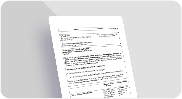 26 Benefits In-Network Out-of-Network Vision Services (For medical and surgical treatment of injuries and/or diseases of the eye) Certain vision screenings required by Federal law are covered under the "Preventive Care" benefit. Benefits are based on the setting in which Covered Services are received. Human Organ and Tissue Transplant (Bone Marrow / Stem Cell), Cellular and Gene Therapy Services Please call our Transplant Department as soon as you think you may need a Covered Procedure to talk about your benefit options. To get the In-Network Level of benefits under your Plan, you must get certain Covered Procedures from an Approved In-Network Provider. Even if a Hospital is an In-Network Provider for other services, it may not be an Approved In-Network Provider for certain Covered Procedures. Please see the “What’s Covered” section for further details. The requirements described below do not apply to the following: • Cornea transplants, which are covered as any other surgery; and • Any Covered Services related to a Covered Procedure that you get before or after the Benefit Period. Benefits for Covered Services that are not part of the Covered Procedure will be based on the setting in which Covered Services are received. Please see the “What’s Covered” section for additional details Approved In-Network Provider All Other Providers Covered Procedure Benefit Period The number of days or the applicable case rate / global time period will vary depending on the type of Covered Procedure and the Approved In-Network Provider agreement. Before and after the Covered Procedure Benefit Period, Covered Services will be covered as Inpatient Services, Outpatient Services, Home Visits, or Office Visits depending on where the service is performed. Not applicable – There is no unique Benefit Period for services from All Other Providers
