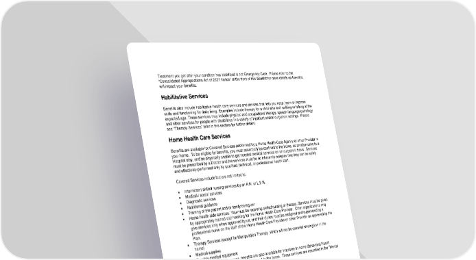 47 Treatment you get after your condition has stabilized is not Emergency Care. Please refer to the “Consolidated Appropriations Act of 2021 Notice” at the front of this Booklet for more details on how this will impact your benefits. Habilitative Services Benefits also include habilitative health care services and devices that help you keep, learn or improve skills and functioning for daily living. Examples include therapy for a child who isn’t walking or talking at the expected age. These services may include physical and occupational therapy, speech-language pathology and other services for people with disabilities in a variety of inpatient and/or outpatient settings. Please see “Therapy Services” later in this section for further details. Home Health Care Services Benefits are available for Covered Services performed by a Home Health Care Agency or other Provider in your home. To be eligible for benefits, you must essentially be confined to the home, as an alternative to a Hospital stay, and be physically unable to get needed medical services on an outpatient basis. Services must be prescribed by a Doctor and the services must be so inherently complex that they can be safely and effectively performed only by qualified, technical, or professional health staff. Covered Services include but are not limited to: • Intermittent skilled nursing services by an R.N. or L.P.N. • Medical / social services • Diagnostic services • Nutritional guidance • Training of the patient and/or family/caregiver • Home health aide services. You must be receiving skilled nursing or therapy. Services must be given by appropriately trained staff working for the Home Health Care Provider. Other organizations may give services only when approved by us, and their duties must be assigned and supervised by a professional nurse on the staff of the Home Health Care Provider or other Provider as approved by the Plan. • Therapy Services (except for Manipulation Therapy, which will not be covered when given in the home) • Medical supplies • Durable medical equipment • When available in your area, benefits are also available for Intensive In-home Behavioral Health Services. These do not require confinement to the home. These services are described in the “Mental Health and Substance Use Disorder Services” section below. Benefits may also be available for Inpatient Services in your home. These benefits are separate from the Home Health Care Services benefit, and are described in the “Inpatient Services” section below. Home Infusion Therapy Please see “Therapy Services” later in this section. Hospice Care You are eligible for hospice care if your Physician and the Hospice medical director certify that you are terminally ill and likely have less than twelve (12) months to live. You may access hospice care while participating in a clinical trial or continuing disease modifying therapy, as ordered by your treating Provider. Disease modifying therapy treats the underlying terminal illness.