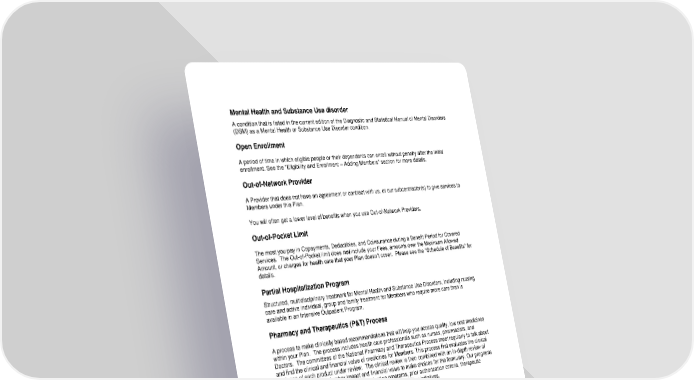 116 Mental Health and Substance Use disorder A condition that is listed in the current edition of the Diagnostic and Statistical Manual of Mental Disorders (DSM) as a Mental Health or Substance Use Disorder condition. Open Enrollment A period of time in which eligible people or their dependents can enroll without penalty after the initial enrollment. See the "Eligibility and Enrollment – Adding Members" section for more details. Out-of-Network Provider A Provider that does not have an agreement or contract with us, or our subcontractor(s) to give services to Members under this Plan. You will often get a lower level of benefits when you use Out-of-Network Providers. Out-of-Pocket Limit The most you pay in Copayments, Deductibles, and Coinsurance during a Benefit Period for Covered Services. The Out-of-Pocket limit does not include your Fees, amounts over the Maximum Allowed Amount, or charges for health care that your Plan doesn’t cover. Please see the “Schedule of Benefits” for details. Partial Hospitalization Program Structured, multidisciplinary treatment for Mental Health and Substance Use Disorders, including nursing care and active individual, group and family treatment for Members who require more care than is available in an Intensive Outpatient Program. Pharmacy and Therapeutics (P&T) Process A process to make clinically based recommendations that will help you access quality, low cost medicines within your Plan. The process includes health care professionals such as nurses, pharmacists, and Doctors. The committees of the National Pharmacy and Therapeutics Process meet regularly to talk about and find the clinical and financial value of medicines for Members. This process first evaluates the clinical evidence of each product under review. The clinical review is then combined with an in-depth review of the market dynamics, Member impact and financial value to make choices for the formulary. Our programs may include, but are not limited to, Drug utilization programs, prior authorization criteria, therapeutic conversion programs, cross-branded initiatives, and Drug profiling initiatives. Pharmacy Benefits Manager (PBM) A Pharmacy benefits management company that manages Pharmacy benefits on our behalf. Our PBM has a nationwide network of Retail Pharmacies, a Home Delivery Pharmacy, and clinical services that include Prescription Drug List management. The management and other services the PBM provides include, but are not limited to: managing a network of Retail Pharmacies and operating a mail service Pharmacy. Our PBM, in consultation with the Plan, also provides services to promote and assist Members in the appropriate use of Pharmacy benefits, such as review for possible excessive use, proper dosage, drug interactions or drug/pregnancy concerns. Physician (Doctor) Includes the following when licensed by law: