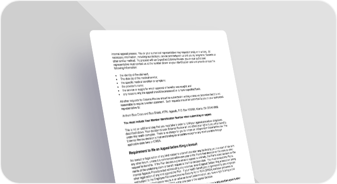 91 internal appeal process. You or your authorized representative may request it orally or in writing. All necessary information, including our decision, can be sent between us and you by telephone, facsimile or other similar method. To proceed with an Expedited External Review, you or your authorized representative must contact us at the number shown on your identification card and provide at least the following information: • the identity of the claimant; • The date (s) of the medical service; • the specific medical condition or symptom; • the provider’s name; • the service or supply for which approval of benefits was sought; and • any reasons why the appeal should be processed on a more expedited basis. All other requests for External Review should be submitted in writing unless we determine that it is not reasonable to require a written statement. Such requests should be submitted by you or your authorized representative to: Anthem Blue Cross and Blue Shield, ATTN: Appeals, P.O. Box 105568; Atlanta, GA 30348-5568. You must include Your Member Identification Number when submitting an appeal. This is not an additional step that you must take in order to fulfill your appeal procedure obligations described above. Your decision to seek External Review will not affect your rights to any other benefits under this health care plan. There is no charge for you to initiate an independent External Review. The External Review decision is final and binding on all parties except for any relief available through applicable state laws or ERISA. Requirement to file an Appeal before filing a lawsuit No lawsuit or legal action of any kind related to a benefit decision may be filed by you in a court of law or in any other forum, unless it is commenced within one year of the Plan's final decision on the claim or other request for benefits. If the Plan decides a grievance or appeal is untimely, the Plan's latest decision on the merits of the underlying claim or benefit request is the final decision date. You must exhaust the Plan's internal Appeals Procedure but not including any voluntary level of appeal, before filing a lawsuit or taking other legal action of any kind against the Plan. If your health benefit plan is sponsored by your employer and subject to the Employee Retirement Income Security Act of 1974 (ERISA) and your grievance or appeal as described above results in an adverse benefit determination, you have a right to bring a civil action under Section 502(a) of ERISA within one year of the appeal decision. We reserve the right to modify the policies, procedures and timeframes in this section upon further clarification from Department of Health and Human Services and Department of Labor.