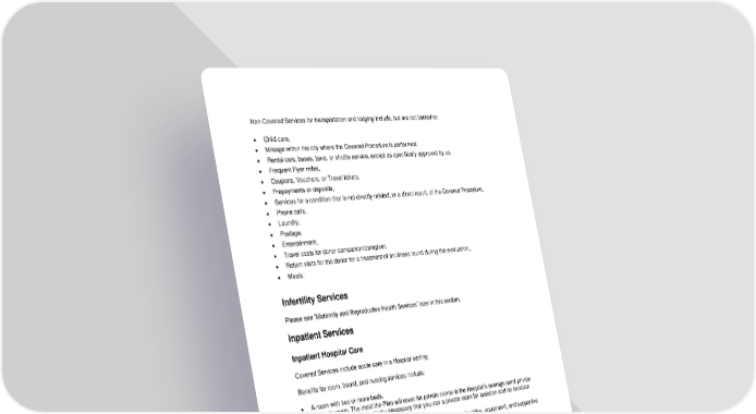 50 Non-Covered Services for transportation and lodging include, but are not limited to: • Child care, • Mileage within the city where the Covered Procedure is performed, • Rental cars, buses, taxis, or shuttle service, except as specifically approved by us, • Frequent Flyer miles, • Coupons, Vouchers, or Travel tickets, • Prepayments or deposits, • Services for a condition that is not directly related, or a direct result, of the Covered Procedure, • Phone calls, • Laundry, • Postage, • Entertainment, • Travel costs for donor companion/caregiver, • Return visits for the donor for a treatment of an illness found during the evaluation, • Meals. Infertility Services Please see ”Maternity and Reproductive Health Services” later in this section. Inpatient Services Inpatient Hospital Care Covered Services include acute care in a Hospital setting. Benefits for room, board, and nursing services include: • A room with two or more beds. • A private room. The most the Plan will cover for private rooms is the Hospital’s average semi-private room rate unless it is Medically Necessary that you use a private room for isolation and no isolation facilities are available. • A room in a special care unit approved by us. The unit must have facilities, equipment, and supportive services for intensive care or critically ill patients. • Routine nursery care for newborns during the mother’s normal Hospital stay. • Meals, special diets. • General nursing services. Benefits for ancillary services include: • Operating, childbirth, and treatment rooms and equipment. • Prescribed Drugs. • Anesthesia, anesthesia supplies and services given by the Hospital or other Provider. • Medical and surgical dressings and supplies, casts, and splints. • Diagnostic services. • Therapy services including infusion therapy services.