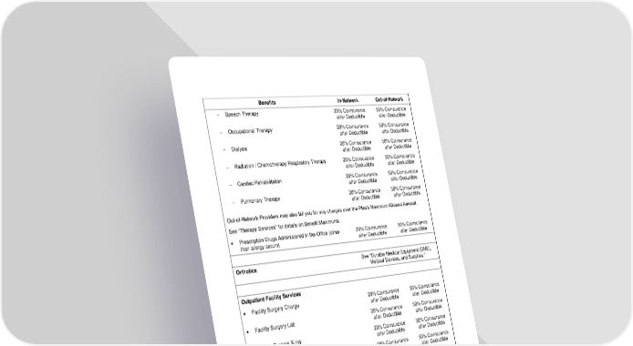 21 Benefits In-Network Out-of-Network - Speech Therapy 20% Coinsurance after Deductible 50% Coinsurance after Deductible - Occupational Therapy 20% Coinsurance after Deductible 50% Coinsurance after Deductible - Dialysis 20% Coinsurance after Deductible 50% Coinsurance after Deductible - Radiation / Chemotherapy Respiratory Therapy 20% Coinsurance after Deductible 50% Coinsurance after Deductible - Cardiac Rehabilitation 20% Coinsurance after Deductible 50% Coinsurance after Deductible - Pulmonary Therapy 20% Coinsurance after Deductible 50% Coinsurance after Deductible Out-of-Network Providers may also bill you for any charges over the Plan’s Maximum Allowed Amount. See “Therapy Services” for details on Benefit Maximums. • Prescription Drugs Administered in the Office (other than allergy serum) 20% Coinsurance after Deductible 50% Coinsurance after Deductible Orthotics See “Durable Medical Equipment (DME), Medical Devices, and Supplies.” Outpatient Facility Services • Facility Surgery Charge 20% Coinsurance after Deductible 50% Coinsurance after Deductible • Facility Surgery Lab 20% Coinsurance after Deductible 50% Coinsurance after Deductible • Facility Surgery X-ray 20% Coinsurance after Deductible 50% Coinsurance after Deductible • Ancillary Services 20% Coinsurance after Deductible 50% Coinsurance after Deductible • Doctor Surgery Charges 20% Coinsurance after Deductible 50% Coinsurance after Deductible • Other Doctor Charges (including Anesthesiologist, Pathologist, Radiologist, Surgical Assistant) 20% Coinsurance after Deductible 50% Coinsurance after Deductible • Other Facility Charges (for procedure rooms) 20% Coinsurance after Deductible 50% Coinsurance after Deductible • Mental Health / Substance Use Disorder Outpatient Facility Services (Partial Hospitalization Program / Intensive Outpatient Program) 20% Coinsurance after Deductible 50% Coinsurance after Deductible