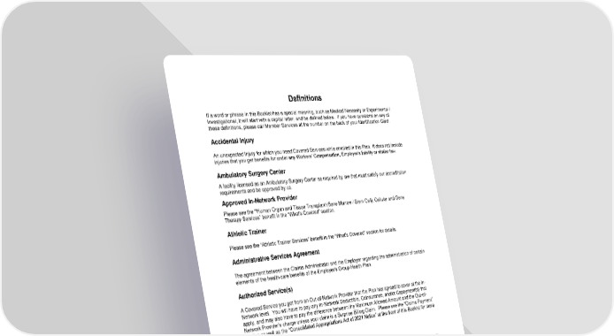110 Definitions If a word or phrase in this Booklet has a special meaning, such as Medical Necessity or Experimental / Investigational, it will start with a capital letter, and be defined below. If you have questions on any of these definitions, please call Member Services at the number on the back of your Identification Card. Accidental Injury An unexpected Injury for which you need Covered Services while enrolled in this Plan. It does not include injuries that you get benefits for under any Workers’ Compensation, Employer’s liability or similar law. Ambulatory Surgery Center A facility licensed as an Ambulatory Surgery Center as required by law that must satisfy our accreditation requirements and be approved by us. Approved In-Network Provider Please see the “Human Organ and Tissue Transplant (Bone Marrow / Stem Cell), Cellular and Gene Therapy Services” benefit in the “What’s Covered” section. Athletic Trainer Please see the “Athletic Trainer Services” benefit in the “What’s Covered” section for details. Administrative Services Agreement The agreement between the Claims Administrator and the Employer regarding the administration of certain elements of the health care benefits of the Employer's Group Health Plan. Authorized Service(s) A Covered Service you get from an Out-of-Network Provider that the Plan has agreed to cover at the In- Network level. You will have to pay any In-Network Deductible, Coinsurance, and/or Copayment(s) that apply, and may also have to pay the difference between the Maximum Allowed Amount and the Out-of- Network Provider’s charge unless your claim is a Surprise Billing Claim. Please see the “Claims Payment” section as well as the “Consolidated Appropriations Act of 2021 Notice” at the front of this Booklet for more details. Benefit Period The length of time the Plan will cover benefits for Covered Services. For Calendar Year plans, the Benefit Period starts on January 1st and ends on December 31st. For Plan Year plans, the Benefit Period starts on your Employer’s effective or renewal date and lasts for 12 months. (See your Employer for details.) The Schedule of Benefits shows if your Plan’s Benefit Period is a Calendar Year or a Plan Year. If your coverage ends before the end of the year, then your Benefit Period also ends. Benefit Period Maximum The most the Plan will cover for a Covered Service during a Benefit Period. Biomarker