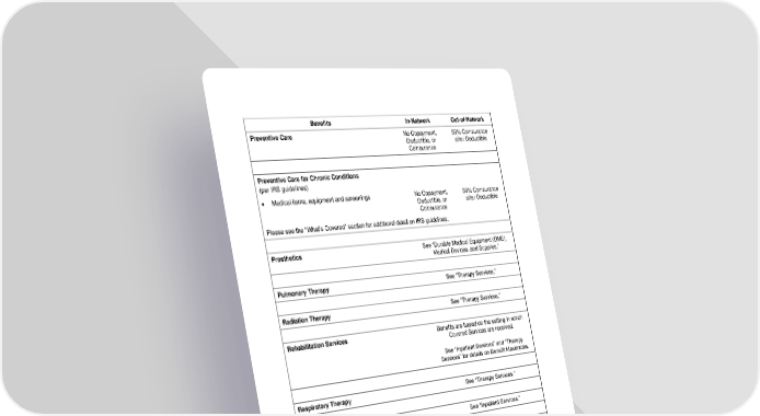 23 Benefits In-Network Out-of-Network Preventive Care No Copayment, Deductible, or Coinsurance 50% Coinsurance after Deductible Preventive Care for Chronic Conditions (per IRS guidelines) • Medical items, equipment and screenings No Copayment, Deductible, or Coinsurance 50% Coinsurance after Deductible Please see the “What’s Covered” section for additional detail on IRS guidelines. Prosthetics See “Durable Medical Equipment (DME), Medical Devices, and Supplies.” Pulmonary Therapy See “Therapy Services.” Radiation Therapy See “Therapy Services.” Rehabilitation Services Benefits are based on the setting in which Covered Services are received. See “Inpatient Services” and “Therapy Services” for details on Benefit Maximums. Respiratory Therapy See “Therapy Services.” Skilled Nursing Facility See “Inpatient Services.” Speech Therapy See “Therapy Services.” Surgery Benefits are based on the setting in which Covered Services are received. Bariatric Surgery Benefit Maximum $1,000 per Benefit Period In- and Out-of- Network combined Temporomandibular and Craniomandibular Joint Treatment Benefits are based on the setting in which Covered Services are received.