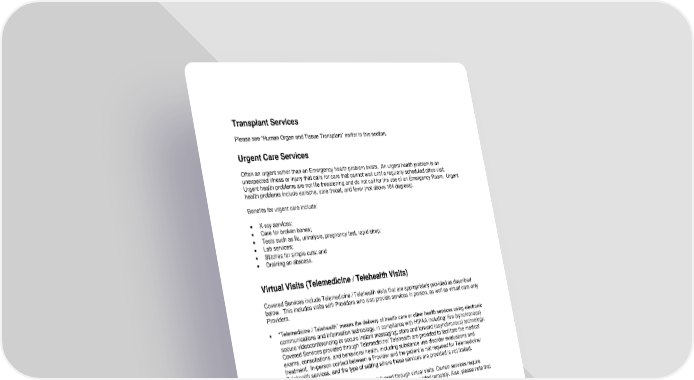 60 Transplant Services Please see “Human Organ and Tissue Transplant” earlier in this section. Urgent Care Services Often an urgent rather than an Emergency health problem exists. An urgent health problem is an unexpected illness or injury that calls for care that cannot wait until a regularly scheduled office visit. Urgent health problems are not life threatening and do not call for the use of an Emergency Room. Urgent health problems include earache, sore throat, and fever (not above 104 degrees). Benefits for urgent care include: • X-ray services; • Care for broken bones; • Tests such as flu, urinalysis, pregnancy test, rapid strep; • Lab services; • Stitches for simple cuts; and • Draining an abscess. Virtual Visits (Telemedicine / Telehealth Visits) Covered Services include Telemedicine / Telehealth visits that are appropriately provided as described below. This includes visits with Providers who also provide services in person, as well as virtual care-only Providers. • “Telemedicine / Telehealth” means the delivery of health care or other health services using electronic communications and information technology, in compliance with HIPAA including: live (synchronous) secure videoconferencing or secure instant messaging; store and forward (asynchronous) technology. Covered Services provided through Telemedicine/ Telehealth are provided to facilitate the medical exams, consultations, and behavioral health, including substance use disorder evaluations and treatment. In-person contact between a Provider and the patient is not required for Telemedicine/ Telehealth services, and the type of setting where these services are provided is not limited. Please Note: Not all health services can be delivered through virtual visits. Certain services require equipment and/or direct physical hands-on care that cannot be provided remotely. Also, please note that not all Providers offer virtual visits. Benefits do not include the use of facsimile, texting, electronic mail, or non-secure instant messaging unless you have an already established relationship with the Provider. Benefits also do not include reporting normal lab or other test results, requesting office visits, getting answers to billing, insurance coverage or payment questions, asking for referrals to Providers outside our network, benefit precertification, or Provider to Provider discussions except as approved under “Office and Home Visits.” If you have any questions about this coverage, please contact Member Services at the number on the back of your Identification Card. Vision Services Benefits include medical and surgical treatment of injuries and illnesses of the eye. Certain vision screenings required by Federal law are covered under the “Preventive Care” benefit.