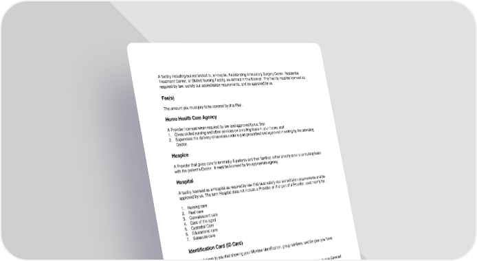 114 A facility including but not limited to, a Hospital, freestanding Ambulatory Surgery Center, Residential Treatment Center, or Skilled Nursing Facility, as defined in this Booklet. The Facility must be licensed as required by law, satisfy our accreditation requirements, and be approved by us. Fee(s) The amount you must pay to be covered by this Plan. Home Health Care Agency A Provider licensed when required by law and approved by us, that: 1. Gives skilled nursing and other services on a visiting basis in your home; and 2. Supervises the delivery of services under a plan prescribed and approved in writing by the attending Doctor. Hospice A Provider that gives care to terminally ill patients and their families, either directly or on a consulting basis with the patient’s Doctor. It must be licensed by the appropriate agency. Hospital A facility licensed as a Hospital as required by law that must satisfy our accreditation requirements and be approved by us. The term Hospital does not include a Provider, or that part of a Provider, used mainly for: 1. Nursing care 2. Rest care 3. Convalescent care 4. Care of the aged 5. Custodial Care 6. Educational care 7. Subacute care Identification Card (ID Card) The card given to you that showing your Member identification, group numbers, and the plan you have. In-Network Provider A Provider that has a contract, either directly or indirectly, with us, or another organization, to give Covered Services to Members through negotiated payment arrangements. A Provider that is In-Network for one plan may not be In-Network for another. Please see “How to Find a Provider in the Network” in the section “How Your Plan Works” for more information on how to find an In-Network Provider for this Plan. Inpatient A Member who is treated as a registered bed patient in a Hospital and for whom a room and board charge is made. Intensive In-Home Behavioral Health Program A range of therapy services provided in the home to address symptoms and behaviors that, as the result of a Mental Disorder or Substance Use Disorder, put the Members and others at risk of harm.