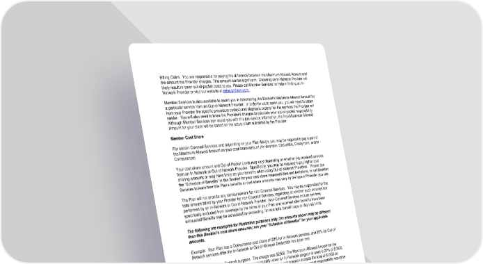 73 Billing Claim. You are responsible for paying the difference between the Maximum Allowed Amount and the amount the Provider charges. This amount can be significant. Choosing an In-Network Provider will likely result in lower out-of-pocket costs to you. Please call Member Services for help in finding an In- Network Provider or visit our website at www.anthem.com . Member Services is also available to assist you in determining this Booklet’s Maximum Allowed Amount for a particular service from an Out-of-Network Provider. In order for us to assist you, you will need to obtain from your Provider the specific procedure code(s) and diagnosis code(s) for the services the Provider will render. You will also need to know the Provider’s charges to calculate your out-of-pocket responsibility. Although Member Services can assist you with this pre-service information, the final Maximum Allowed Amount for your claim will be based on the actual claim submitted by the Provider. Member Cost Share For certain Covered Services and depending on your Plan design, you may be required to pay a part of the Maximum Allowed Amount as your cost share amount (for example, Deductible, Copayment, and/or Coinsurance). Your cost share amount and Out-of-Pocket Limits may vary depending on whether you received services from an In-Network or Out-of-Network Provider. Specifically, you may be required to pay higher cost sharing amounts or may have limits on your benefits when using Out-of-Network Providers. Please see the “Schedule of Benefits” in this Booklet for your cost share responsibilities and limitations, or call Member Services to learn how this Plan’s benefits or cost share amounts may vary by the type of Provider you use. The Plan will not provide any reimbursement for non-Covered Services. You may be responsible for the total amount billed by your Provider for non-Covered Services, regardless of whether such services are performed by an In-Network or Out-of-Network Provider. Non-Covered Services include services specifically excluded from coverage by the terms of your Plan and received after benefits have been exhausted Benefits may be exhausted by exceeding, for example, benefit caps or day/visit limits. The following are examples for illustrative purposes only; the amounts shown may be different than this Booklet’s cost share amounts; see your “Schedule of Benefits” for your applicable amounts. Example: Your Plan has a Coinsurance cost share of 20% for In-Network services, and 30% for Out-of- Network services after the In-Network or Out-of-Network Deductible has been met. • You choose an In-Network surgeon. The charge was $2500. The Maximum Allowed Amount for the surgery is $1500; your Coinsurance responsibility when an In-Network surgeon is used is 20% of $1500, or $300. We allow 80% of $1500, or $1200. The In-Network surgeon accepts the total of $1500 as reimbursement for the surgery regardless of the charges. Your total out-of-pocket responsibility would be $300. • You choose an Out-of-Network surgeon. The Out-of-Network surgeon’s charge for the service is $2500. The Maximum Allowed Amount for the surgery service is $1500; your Coinsurance responsibility for the OUT-OF-NETWORK surgeon is 30% of $1500, or $450 after the OUT-OF-NETWORK Deductible has been met. We allow the remaining 70% of $1500, or $1050. In addition, the Out-of-Network surgeon could bill you the difference between $2500 and $1500, so your total Out-of-Pocket charge would be $450 plus an additional $1000, for a total of $1450. Authorized Services In some circumstances, such as where there is no In-Network Provider available for the Covered Service, we may authorize the In-Network cost share amounts (Deductible, Copayment, and/or Coinsurance) to apply to a claim for a Covered Service you receive from an Out-of-Network Provider. In such circumstances, you must contact us in advance of obtaining the Covered Service. We also may authorize