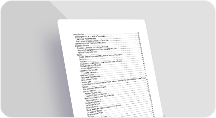 9 Dental Services .........................................................................................................................................42 Preparing the Mouth for Medical Treatments ........................................................................................42 Treatment of Accidental Injury ...............................................................................................................42 Anesthesia and Hospital Charges for Dental Care................................................................................42 Diabetes Equipment, Education, and Supplies .........................................................................................42 Diagnostic Services ...................................................................................................................................43 Diagnostic Laboratory and Pathology Services.....................................................................................43 Diagnostic Imaging Services and Electronic Diagnostic Tests..............................................................43 Advanced Imaging Services ..................................................................................................................43 Dialysis ......................................................................................................................................................43 Durable Medical Equipment (DME), Medical Devices, and Supplies....................................................44 Orthotics.................................................................................................................................................44 Prosthetics .............................................................................................................................................44 Prosthetic Limbs & Orthotic Custom Fabricated Brace or Support .......................................................45 Medical and Surgical Supplies...............................................................................................................45 Blood and Blood Products .....................................................................................................................45 Emergency Care Services.........................................................................................................................45 Emergency Services..............................................................................................................................46 Habilitative Services ..................................................................................................................................47 Home Health Care Services......................................................................................................................47 Home Infusion Therapy .............................................................................................................................47 Hospice Care.............................................................................................................................................47 Human Organ and Tissue Transplant (Bone Marrow / Stem Cell) Services, Cellular and Gene Therapy Services.....................................................................................................................................................48 Prior Approval and Precertification............................................................................................................49 Inpatient Services ......................................................................................................................................50 Inpatient Hospital Care ..........................................................................................................................50 Inpatient Professional Services .............................................................................................................51 Maternity and Reproductive Health Services ............................................................................................51 Maternity Services .................................................................................................................................51 Contraceptive Benefits ..............................................................................................................................52 Sterilization Services .................................................................................................................................52 Infertility Services ......................................................................................................................................52 Mental Health and Substance Use Disorder Services ..............................................................................52 Occupational Therapy ...............................................................................................................................53 Office and Home Visits..............................................................................................................................53 Orthotics ....................................................................................................................................................54 Outpatient Facility Services.......................................................................................................................54 Physical Therapy .......................................................................................................................................54 Preventive Care.........................................................................................................................................54 Preventive Care for Chronic Conditions (per IRS guidelines) ...................................................................56 Prosthetics..........................................