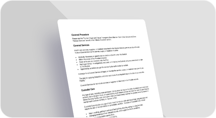 112 Covered Procedure Please see the “Human Organ and Tissue Transplant (Bone Marrow / Stem Cell), Cellular and Gene Therapy Services” benefit in the “What’s Covered” section. Covered Services Health care services, supplies, or treatment described in this Booklet that are given to you by a Provider. To be a Covered Service the service, supply or treatment must be: • Medically Necessary or specifically included as a benefit under this Booklet. • Within the scope of the Provider’s license. • Given while you are covered under the Plan. • Not Experimental / Investigational, excluded, or limited by this Booklet, or by any amendment or rider to this Booklet. • Approved by us before you get the service if prior authorization is needed. A charge for a Covered Service will apply on the date the service, supply, or treatment was given to you. The date for applying Deductible and other cost shares for an Inpatient stay is the date of you enter the Facility.” Covered Services do not include services or supplies not described in the Provider records. Custodial Care Any type of care, including room and board, that (a) does not require the skills of professional or technical workers; (b) is not given to you or supervised by such workers or does not meet the rules for post-Hospital Skilled Nursing Facility care; (c) is given when you have already reached the greatest level of physical or mental health and are not likely to improve further. Custodial Care includes any type of care meant to help you with activities of daily living that does not require the skill of trained medical or paramedical workers. Examples of Custodial Care include: • Help in walking, getting in and out of bed, bathing, dressing, eating, or using the toilet, • Changing dressings of non-infected wounds, after surgery or chronic conditions, • Preparing meals and/or special diets, • Feeding by utensil, tube, or gastrostomy, • Common skin and nail care, • Supervising medicine that you can take yourself, • Catheter care, general colostomy or ileostomy care, • Routine services which we decide can be safely done by you or a non-medical person without the help of trained medical and paramedical workers, • Residential care and adult day care, • Protective and supportive care, including education, • Rest and convalescent care. Care can be Custodial even if it is recommended by a professional or performed in a Facility, such as a Hospital or Skilled Nursing Facility, or at home.