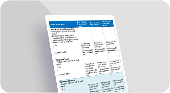 Huntington County Community School Corp HS 3 Tire Opt 4 Rx carveout Page 5 of 9 Covered Medical Benefits Cost if you use a Preferred Network Provider Cost if you use an In- Network Provider Cost if you use an Out-of-Network Provider Rehabilitation and Habilitation services including physical, occupational and speech therapies. Coverage for physical and occupational therapies is limited to 40 visits combined per benefit period. Coverage for speech therapy is limited to 20 visits per benefit period. Office $30 copay per visit medical deductible does not apply $80 copay per visit medical deductible does not apply 50% coinsurance after medical deductible is met Outpatient Hospital 20% coinsurance after medical deductible is met 40% coinsurance after medical deductible is met 50% coinsurance after medical deductible is met Manipulation Therapy Coverage is limited to 12 visits per benefit period. Office $30 copay per visit medical deductible does not apply $80 copay per visit medical deductible does not apply 50% coinsurance after medical deductible is met Outpatient Hospital 20% coinsurance after medical deductible is met 40% coinsurance after medical deductible is met 50% coinsurance after medical deductible is met Pulmonary rehabilitation Coverage is limited to 20 visits per benefit period. Office $30 copay per visit medical deductible does not apply $80 copay per visit medical deductible does not apply 50% coinsurance after medical deductible is met Outpatient Hospital 20% coinsurance after medical deductible is met 40% coinsurance after medical deductible is met 50% coinsurance after medical deductible is met Cardiac rehabilitation Coverage is limited to 36 visits per benefit period. Office $30 copay per visit medical deductible does not apply $80 copay per visit medical deductible does not apply 50% coinsurance after medical deductible is met Outpatient Hospital 20% coinsurance after medical deductible is met 40% coinsurance after medical deductible is met 50% coinsurance after medical deductible is met Dialysis/Hemodialysis Office No charge No charge 50% coinsurance after medical deductible is met