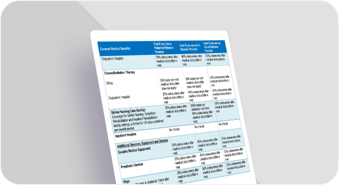 Huntington County Community School Corp HS 3 Tire Opt 4 Rx carveout Page 6 of 9 Covered Medical Benefits Cost if you use a Preferred Network Provider Cost if you use an In- Network Provider Cost if you use an Out-of-Network Provider Outpatient Hospital 20% coinsurance after medical deductible is met 40% coinsurance after medical deductible is met 50% coinsurance after medical deductible is met Chemo/Radiation Therapy Office $30 copay per visit medical deductible does not apply‡ $80 copay per visit medical deductible does not apply‡ 50% coinsurance after medical deductible is met Outpatient Hospital 20% coinsurance after medical deductible is met 40% coinsurance after medical deductible is met 50% coinsurance after medical deductible is met Skilled Nursing Care (facility) Coverage for Skilled Nursing, Outpatient Rehabilitation and Inpatient Rehabilitation facility settings is limited to 150 days combined per benefit period. 20% coinsurance after medical deductible is met $500 copay per admission and then 40% coinsurance after medical deductible is met 50% coinsurance after medical deductible is met Inpatient Hospice No charge No charge No charge Additional Services, Equipment and Devices Durable Medical Equipment 20% coinsurance after medical deductible is met 40% coinsurance after medical deductible is met 50% coinsurance after medical deductible is met Prosthetic Devices 20% coinsurance after medical deductible is met 40% coinsurance after medical deductible is met 50% coinsurance after medical deductible is met Wigs Coverage for wigs is limited to 1 item after cancer treatment per benefit period. 20% coinsurance after medical deductible is met 40% coinsurance after medical deductible is met 50% coinsurance after medical deductible is met Notes: • Dependent Age Limit: to the end of the month in which the child attains age 26. • Members are encouraged to always obtain prior approval when using Out-of-Network Providers. Precertification will help the member know if the services are considered not medically necessary. • No charge means no deductible / copayment / coinsurance up to the maximum allowable amount. 0% means no coinsurance up to the maximum allowable amount. However, when choosing an Out-of-Network Provider, the member is responsible for any balance due after the plan payment. • If you have an office visit with your Primary Care Physician or Specialist at an Outpatient Facility (e.g., Hospital or Ambulatory Surgical Facility), benefits for Covered Services will be paid under “Outpatient Facility Services”. • Costs may vary by the site of service. Other cost shares may apply depending on services provided. Check your Certificate of Coverage for details. • The limits for physical, occupational, and speech therapy, if any apply to this plan, will not apply if you get care as part of the Mental Health and Substance Use Disorder benefit. • ‡ You will pay your PCP or Specialist office visit copay for certain services provided in their office. • The representations of benefits in this document are subject to Indiana Department of Insurance (IN DOI) approval and are subject to change.