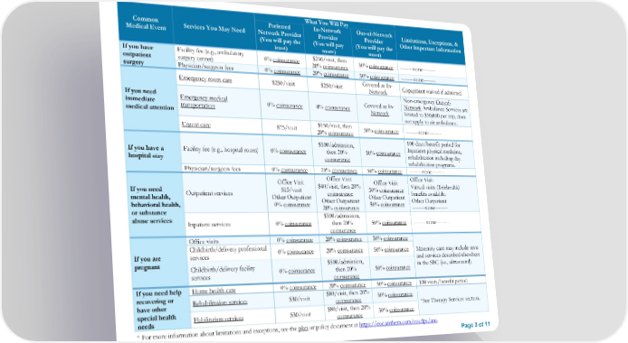 What You Will Pay Common Preferred In-Network Out-of-Network Limitations, Exceptions, & Medical Event Services You May Need Network Provider Provider Provider Other Important Information (You will pay the (You will pay (You will pay the least) more) most) If you have Facility fee (e.g., ambulatory 0% coinsurance $250/visit, then 50% coinsurance --------none-------- outpatient surgery center) 20% coinsurance surgery Physician/surgeon fees 0% coinsurance 20% coinsurance 50% coinsurance --------none-------- Emergency room care $250/visit $250/visit Covered as In- Copayment waived if admitted. Network If you need Non-emergency Out-of- immediate Emergency medical 0% coinsurance 0% coinsurance Covered as In- Network Ambulance Services are medical attention transportation Network limited to $50,000 per trip, does not apply to air ambulance. Urgent care $75/visit $150/visit, then 50% coinsurance --------none-------- 20% coinsurance $500/admission, 100 days/benefit period for If you have a Facility fee (e.g., hospital room) 0% coinsurance then 20% 50% coinsurance Inpatient physical medicine, hospital stay coinsurance rehabilitation including day rehabilitation programs. Physician/surgeon fees 0% coinsurance 20% coinsurance 50% coinsurance --------none-------- Office Visit Office Visit Office Visit Office Visit If you need $15/visit $40/visit, then 20% 50% coinsurance Virtual visits (Telehealth) mental health, Outpatient services Other Outpatient coinsurance Other Outpatient benefits available. behavioral health, 0% coinsurance Other Outpatient 50% coinsurance Other Outpatient or substance 20% coinsurance --------none-------- abuse services $500/admission, Inpatient services 0% coinsurance then 20% 50% coinsurance --------none-------- coinsurance Office visits 0% coinsurance 20% coinsurance 50% coinsurance Childbirth/delivery professional 0% coinsurance 20% coinsurance 50% coinsurance Maternity care may include tests If you are services and services described elsewhere pregnant Childbirth/delivery facility $500/admission, in the SBC (i.e., ultrasound). services 0% coinsurance then 20% 50% coinsurance coinsurance If you need help Home health care 0% coinsurance 20% coinsurance 50% coinsurance 100 visits/benefit period. recovering or Rehabilitation services $30/visit $80/visit, then 20% 50% coinsurance have other coinsurance *See Therapy Services section. special health Habilitation services $30/visit $80/visit, then 20% 50% coinsurance needs coinsurance * For more information about limitations and exceptions, see the plan or policy document at https://eoc.anthem.com/eocdps/aso. Page 3 of 11