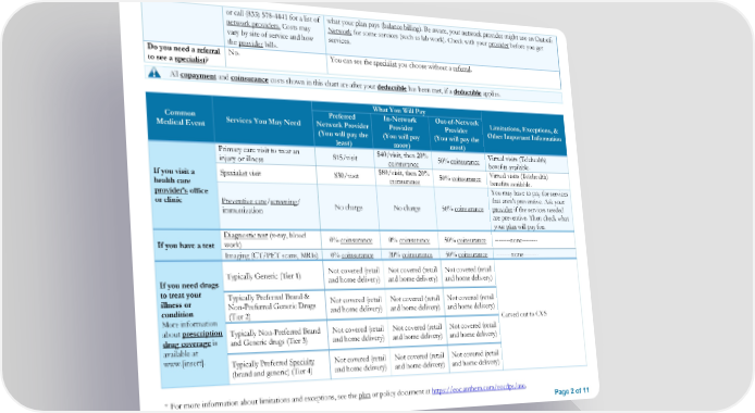 or call (833) 578-4441 for a list of what your plan pays (balance billing). Be aware, your network provider might use an Out-of- network providers. Costs may Network for some services (such as lab work). Check with your provider before you get vary by site of service and how services. the provider bills. Do you need a referral No. You can see the specialist you choose without a referral. to see a specialist? All copayment and coinsurance costs shown in this chart are after your deductible has been met, if a deductible applies. What You Will Pay Common Preferred In-Network Out-of-Network Limitations, Exceptions, & Medical Event Services You May Need Network Provider Provider Provider Other Important Information (You will pay the (You will pay (You will pay the least) more) most) Primary care visit to treat an $15/visit $40/visit, then 20% 50% coinsurance Virtual visits (Telehealth) injury or illness coinsurance benefits available. If you visit a Specialist visit $30/visit $80/visit, then 20% 50% coinsurance Virtual visits (Telehealth) health care coinsurance benefits available. provider’s office You may have to pay for services or clinic Preventive care/screening/ that aren't preventive. Ask your immunization No charge No charge 50% coinsurance provider if the services needed are preventive. Then check what your plan will pay for. Diagnostic test (x-ray, blood 0% coinsurance 0% coinsurance 50% coinsurance --------none-------- If you have a test work) Imaging (CT/PET scans, MRIs) 0% coinsurance 20% coinsurance 50% coinsurance --------none-------- Typically Generic (Tier 1) Not covered (retail Not covered (retail Not covered (retail If you need drugs and home delivery) and home delivery) and home delivery) to treat your Typically Preferred Brand & Not covered (retail Not covered (retail Not covered (retail illness or Non-Preferred Generic Drugs and home delivery) and home delivery) and home delivery) condition (Tier 2) More information Carved out to CVS about prescription Typically Non-Preferred Brand Not covered (retail Not covered (retail Not covered (retail drug coverage is and Generic drugs (Tier 3) and home delivery) and home delivery) and home delivery) available at www.[insert]. Typically Preferred Specialty Not covered (retail Not covered (retail Not covered (retail (brand and generic) (Tier 4) and home delivery) and home delivery) and home delivery) * For more information about limitations and exceptions, see the plan or policy document at https://eoc.anthem.com/eocdps/aso. Page 2 of 11