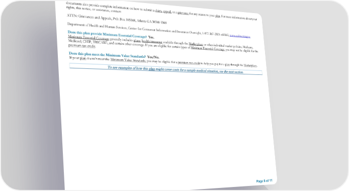 documents also provide complete information on how to submit a claim, appeal, or a grievance for any reason to your plan. For more information about your rights, this notice, or assistance, contact: ATTN: Grievances and Appeals, P.O. Box 105568, Atlanta GA 30348-5568 Department of Health and Human Services, Center for Consumer Information and Insurance Oversight, 1-877-267-2323 x61565, www.cciio.cms.gov Does this plan provide Minimum Essential Coverage? Yes. Minimum Essential Coverage generally includes plans, health insurance available through the Marketplace or other individual market policies, Medicare, Medicaid, CHIP, TRICARE, and certain other coverage. If you are eligible for certain types of Minimum Essential Coverage, you may not be eligible for the premium tax credit. Does this plan meet the Minimum Value Standards? Yes/No. If your plan doesn’t meet the Minimum Value Standards, you may be eligible for a premium tax credit to help you pay for a plan through the Marketplace. To see examples of how this plan might cover costs for a sample medical situation, see the next section. Page 5 of 11