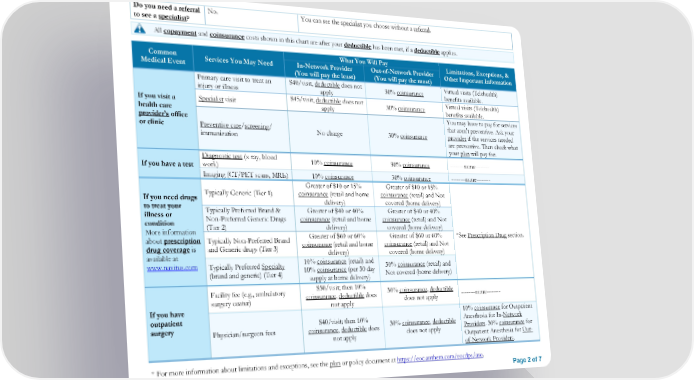 * For more information about limitations and exceptions, see the plan or policy document at https://eoc.anthem.com/eocdps/aso. Page 2 of 7 Do you need a referral to see a specialist? No. You can see the specialist you choose without a referral. All copayment and coinsurance costs shown in this chart are after your deductible has been met, if a deductible applies. Common Medical Event Services You May Need What You Will Pay Limitations, Exceptions, & Other Important Information In-Network Provider (You will pay the least) Out-of-Network Provider (You will pay the most) If you visit a health care provider’s office or clinic Primary care visit to treat an injury or illness $40/visit, deductible does not apply 30% coinsurance Virtual visits (Telehealth) benefits available. Specialist visit $45/visit, deductible does not apply 30% coinsurance Virtual visits (Telehealth) benefits available. Preventive care/screening/ immunization No charge 30% coinsurance You may have to pay for services that aren't preventive. Ask your provider if the services needed are preventive. Then check what your plan will pay for. If you have a test Diagnostic test (x-ray, blood work) 10% coinsurance 30% coinsurance --------none-------- Imaging (CT/PET scans, MRIs) 10% coinsurance 30% coinsurance --------none-------- If you need drugs to treat your illness or condition More information about prescription drug coverage is available at www.navitus.com Typically Generic (Tier 1) Greater of $10 or 15% coinsurance (retail and home delivery) Greater of $10 or 15% coinsurance (retail) and Not covered (home delivery) *See Prescription Drug section. Typically Preferred Brand & Non-Preferred Generic Drugs (Tier 2) Greater of $40 or 40% coinsurance (retail and home delivery) Greater of $40 or 40% coinsurance (retail) and Not covered (home delivery) Typically Non-Preferred Brand and Generic drugs (Tier 3) Greater of $60 or 60% coinsurance (retail and home delivery) Greater of $60 or 60% coinsurance (retail) and Not covered (home delivery) Typically Preferred Specialty (brand and generic) (Tier 4) 10% coinsurance (retail) and 10% coinsurance (per 30 day supply at home delivery) 30% coinsurance (retail) and Not covered (home delivery) If you have outpatient surgery Facility fee (e.g., ambulatory surgery center) $50/visit; then 10% coinsurance, deductible does not apply 30% coinsurance, deductible does not apply --------none-------- Physician/surgeon fees $40/visit; then 10% coinsurance, deductible does not apply 30% coinsurance, deductible does not apply 10% coinsurance for Outpatient Anesthesia for In-Network Providers. 30% coinsurance for Outpatient Anesthesia for Out- of-Network Providers.