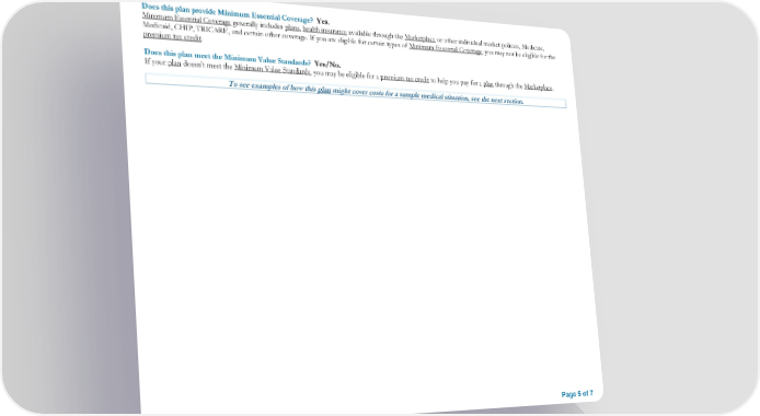 Page 5 of 7 Does this plan provide Minimum Essential Coverage? Yes. Minimum Essential Coverage generally includes plans, health insurance available through the Marketplace or other individual market policies, Medicare, Medicaid, CHIP, TRICARE, and certain other coverage. If you are eligible for certain types of Minimum Essential Coverage, you may not be eligible for the premium tax credit. Does this plan meet the Minimum Value Standards? Yes/No. If your plan doesn’t meet the Minimum Value Standards, you may be eligible for a premium tax credit to help you pay for a plan through the Marketplace. To see examples of how this plan might cover costs for a sample medical situation, see the next section.