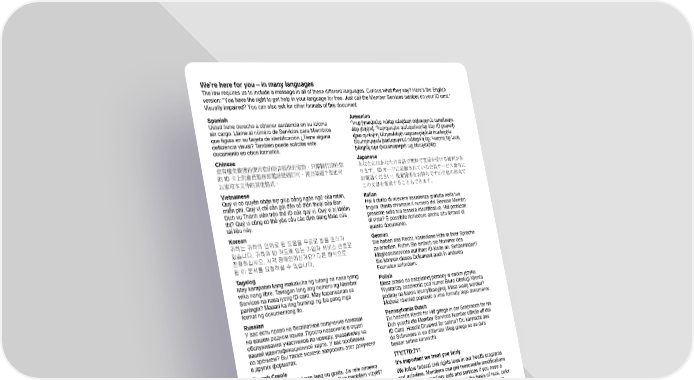 63658MUMENMUB 10/24 #AG-GEN-001# Page 7 of 7 We’re here for you – in many languages The law requires us to include a message in all of these different languages. Curious what they say? Here’s the English version: “You have the right to get help in your language for free. Just call the Member Services number on your ID card.” Visually impaired? You can also ask for other formats of this document TTY/TTD:711 It’s important we treat you fairly We follow federal civil rights laws in our health programs and activities. Members can get reasonable modifications as well as free auxiliary aids and services if you have a disability. We don’t discriminate, on the basis of race, color, national origin, sex, age or disability. For people whose primary language isn’t English (or have limited proficiency), we offer free language assistance services like interpreters and other written languages. Interested in these services? Call the Member Services number on your ID card for help (TTY/TDD: 711) or visit our website. If you think we failed in any areas or to learn more about grievance procedures, you can mail a complaint to: Compliance Coordinator, P.O. Box 27401, Richmond, VA 23279, or directly to the U.S. Department of Health and Human Services, Office for Civil Rights at 200 Independence Avenue, SW; Room 509F, HHH Building; Washington, D.C. 20201. You can also call 1-800- 368-1019 (TDD: 1-800-537-7697) or visit https://ocrportal.hhs.gov/ocr/portal/lobby.jsf