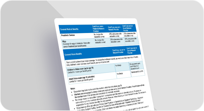 Richmond Community School Trust HealthSync Opt POS HSA 3 Tier Opt E2 Rx Carved out-Custom Page 5 of 7 Covered Medical Benefits Cost if you use a Preferred Network Provider Cost if you use an In- Network Provider Cost if you use an Out-of-Network Provider Prosthetic Devices No charge after deductible is met 20% coinsurance after deductible is met 50% coinsurance after deductible is met Wigs Coverage for wigs is limited to 1 item after cancer treatment per benefit period. No charge after deductible is met 20% coinsurance after deductible is met 50% coinsurance after deductible is met Covered Vision Benefits Cost if you use an In- Network Provider Cost if you use an Out-of-Network Provider This is a brief outline of your vision coverage. To receive the In-Network benefit, you must use a Blue View Vision Provider. Only children's vision services count towards your out-of-pocket limit. Children’s Vision exam (up to age 19) Limited to 1 exam per benefit period. No charge $0 copayment up to plan's Maximum Allowed Amount Adult Vision exam (age 19 and older) Limited to 1 exam per benefit period. No charge Reimbursed Up to $42 Notes: • Dependent Age Limit: to the end of the month in which the child attains age 26. • Members are encouraged to always obtain prior approval when using Out-of-Network Providers. Precertification will help the member know if the services are considered not medically necessary. • No charge means no deductible / copayment / coinsurance up to the maximum allowable amount. 0% means no coinsurance up to the maximum allowable amount. However, when choosing an Out-of-Network Provider, the member is responsible for any balance due after the plan payment. • If you have an office visit with your Primary Care Physician or Specialist at an Outpatient Facility (e.g., Hospital or Ambulatory Surgical Facility), benefits for Covered Services will be paid under “Outpatient Facility Services”. • Costs may vary by the site of service. Other cost shares may apply depending on services provided. Check your Certificate of Coverage for details. • The limits for physical, occupational, and speech therapy, if any apply to this plan, will not apply if you get care as part of the Mental Health and Substance Use Disorder benefit. • The representations of benefits in this document are subject to Indiana Department of Insurance (IN DOI) approval and are subject to change. This summary of benefits is a brief outline of coverage, designed to help you with the selection process. This summary does not reflect each and every benefit, exclusion and limitation which may apply to the coverage. For more details, important limitations and exclusions, please review the formal Evidence of Coverage (EOC). If there is a difference between this summary and the Certificate of Insurance or Evidence of Coverage (EOC), the Certificate of Insurance or Evidence of Coverage (EOC), will prevail. Anthem Blue Cross and Blue Shield is the trade name of Anthem Health Plans, Inc. Independent licensee of the Blue Cross and Blue Shield Association. ® ANTHEM is a registered trademark of Anthem Insurance Companies, Inc. The Blue Cross and Blue Shield names and symbols are registered marks of the Blue Cross and Blue Shield Association. Questions: (833) 578-4441 or visit us at www.anthem.com
